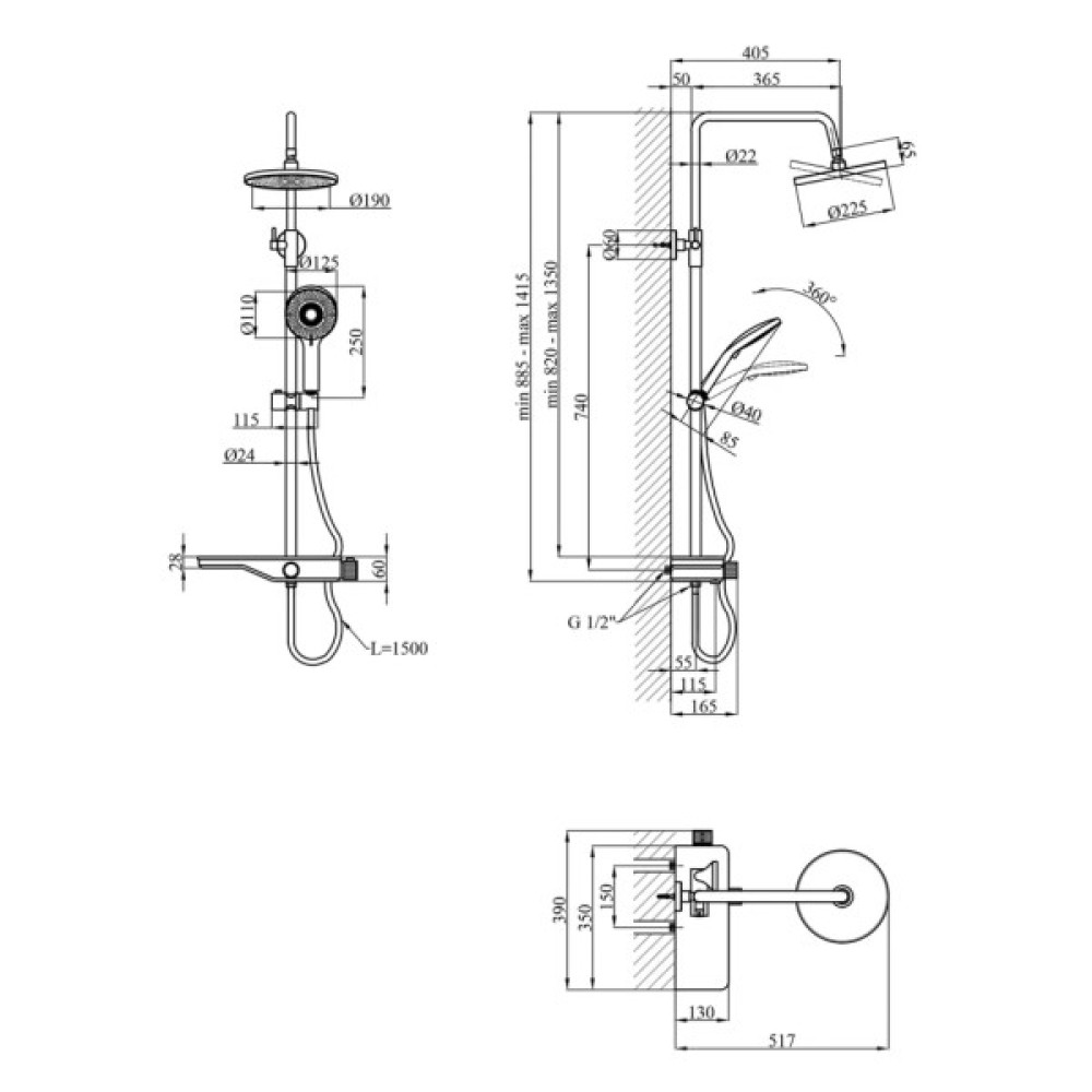 Комплектація ручна лійка; тримач для душу; верхній душ; душова штанга; змішувач; кронштейн; душовий шланг; перемикач