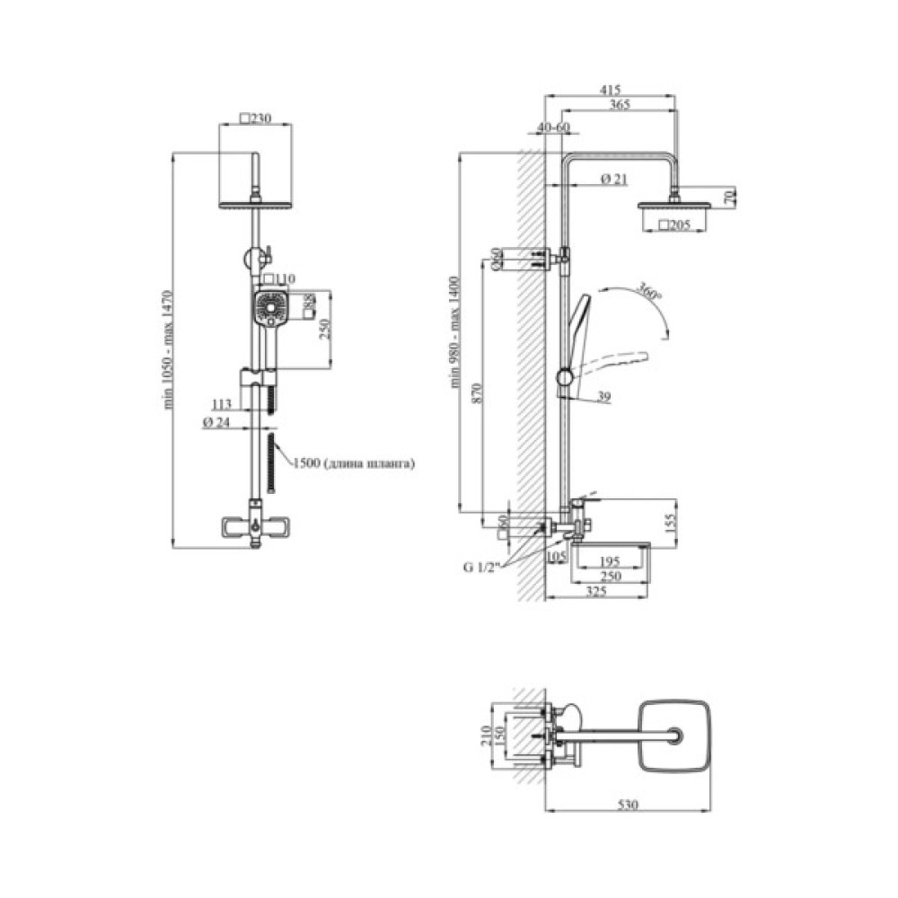 - Верхній душ: 230×230 мм, ручний душ: 110×110 мм з 3 режимами струї.