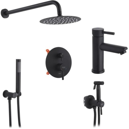 Комплектація: ручна лійка; тримач для душу; верхній душ; змішувач; душовий шланг; вилив для ванни; прихований монтаж