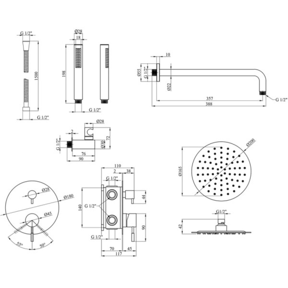 • Комплектація: Тропічний верхній душ, Ручна лійка, Вбудований змішувач з перемикачем