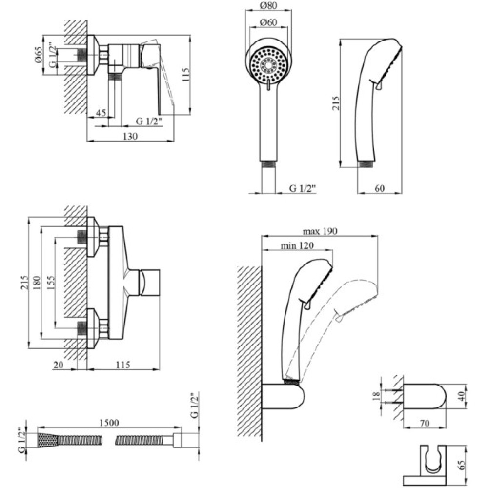 ручна лійка; тримач для душу; змішувач; душовий шланг