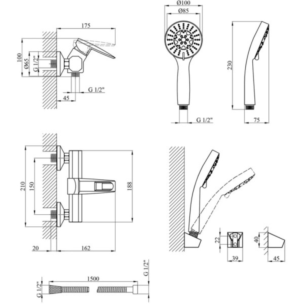ручна лійка; тримач для душу; змішувач; душовий шланг