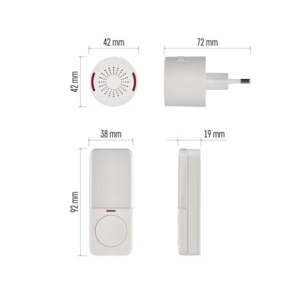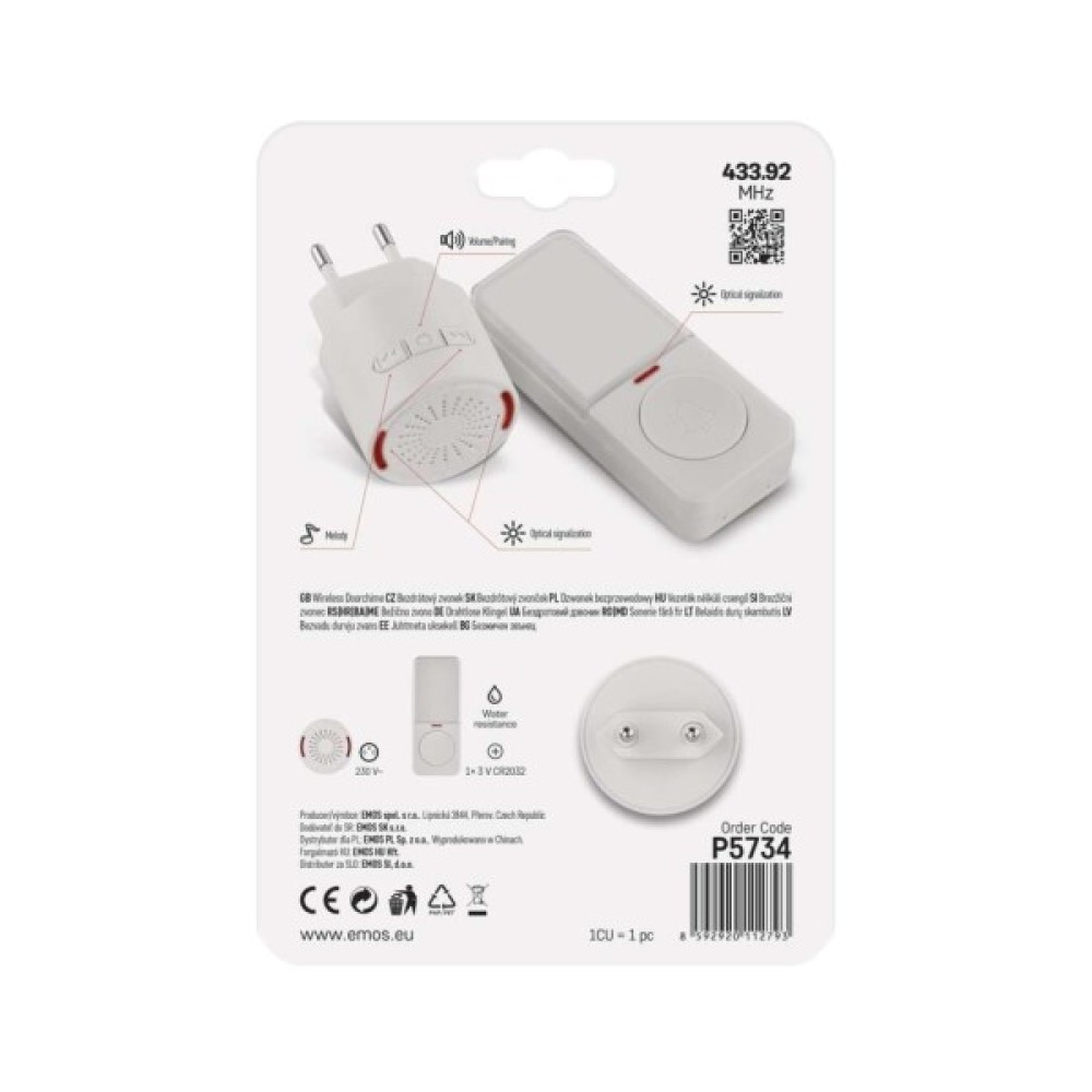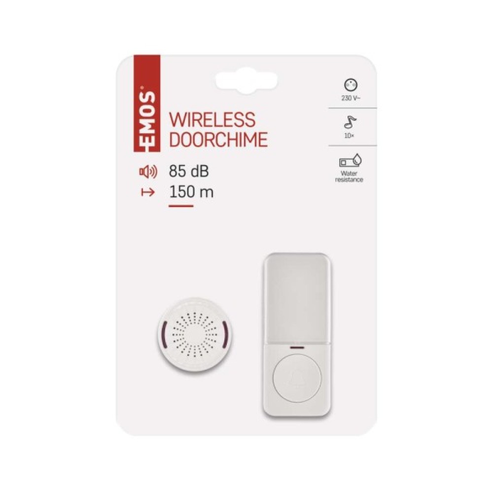 Бездротовий дверний дзвінок P5734Дзвінок P5734 задовольнить усі ваші очікування щодо якісного та надійного помічника. Він не лише оснащений бездротовою кнопкою, яку можна розмістити практично будь-де в межах 150 м від бази. Крім того, ви просто підключаєте головну станцію дзвінка до розетки 230 В і вам більше ні про що не потрібно турбуватися. Вас також порадує вибір з 10 цікавих коротких мелодій.Мінімалістичний дизайнДзвінок підійде для всіх офісів та будинків, власники яких високо цінують дизайн. Цей стильний та практичний дзвінок ідеально підходить для всіх сучасних приміщень.Ви любите тримати все під контролем? Тоді вам сподобається той факт, що і дзвінок, і кнопка оснащені чіткими світловими сигналами, тож ви та ваші гості можете бути впевнені, що все працює належним чином.Бездротова кнопка, основа розеткиКнопка готова до практичного використання. Її можна розмістити на відстані до 150 м від бази, і вона все одно працюватиме бездоганно. Це дозволяє використовувати дзвінок у великих будинках, великих офісах та місцях, де вхідні ворота знаходяться далеко від вхідних дверей. Ви можете розмістити його де завгодно. Тому що він не тільки бездротовий, але й повністю водонепроникний.Регульована гучністьВам набридли довгі мелодії, що лунають з кожним дзвінком? Тоді вам буде приємно дізнатися, що дверний дзвінок EMOS P5734 пропонує 10 приємно коротких мелодій.Дверний дзвінок може відтворювати мелодію інтенсивністю до 85 дБ. Однак, ви можете легко налаштувати гучність дзвінка за бажанням.