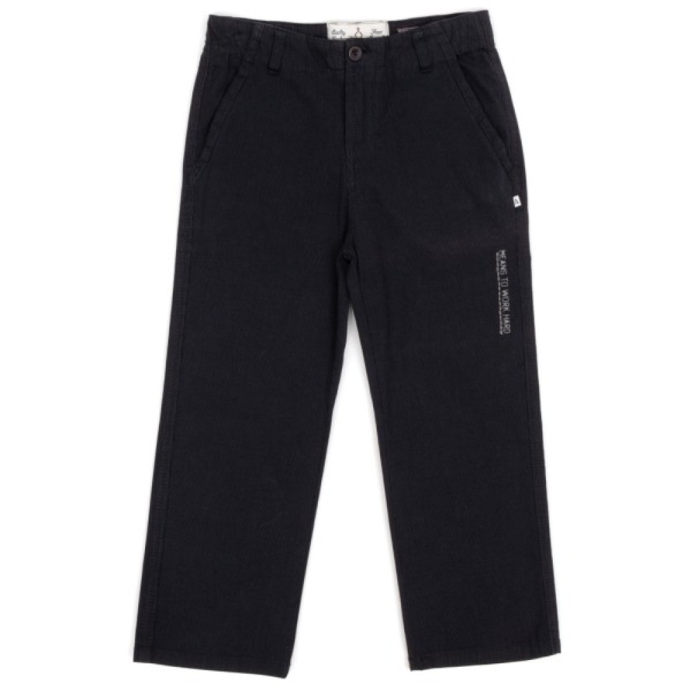 - Тонкі, літні штани в кольорі графіт в стилі під джинс, зі зручною посадкою та стильним мінімалістичним декором для хлопчика від відомої торгової марки AZIZ.