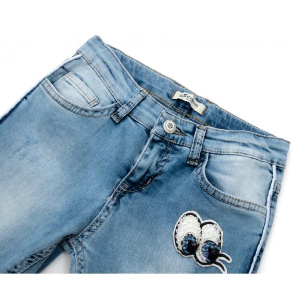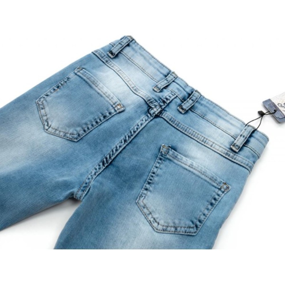 Затишна, облягаюча 5-й кишенькова модель з середньою посадкою, та з декоративними "дірками" і потертостями спереду на штанинах, виконана в приємному блакитному кольорі з тонкого стрейчевого деніму з модним «вареним» ефектом, безперечно сподобається вашій юній модниці.