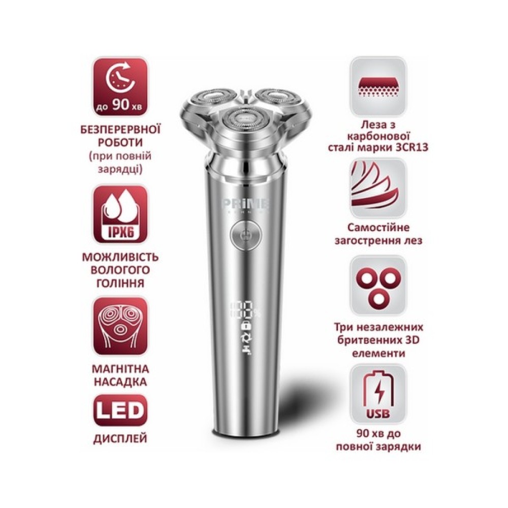 Електробритва роторна, для сухого/вологого гоління, робота від акумулятора/ мережі, час роботи 90 хв, час зарядки 1.5 год, плаваюча система гоління, німецькі леза 3CR13, LED дисплей, індикатор зарядки, ультра-тонка подвійна сітка, магнітна насадка, магнітна насадка , дорожнє блокування, корпус з пластику.