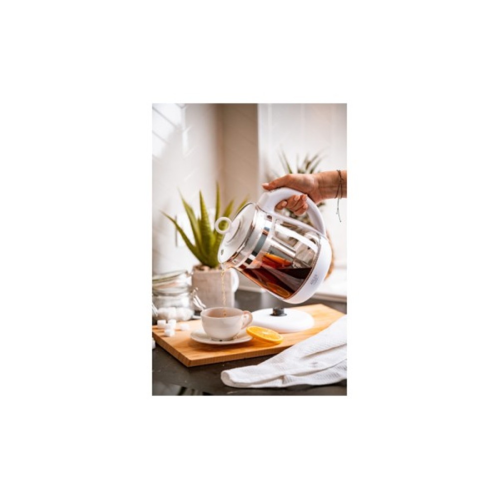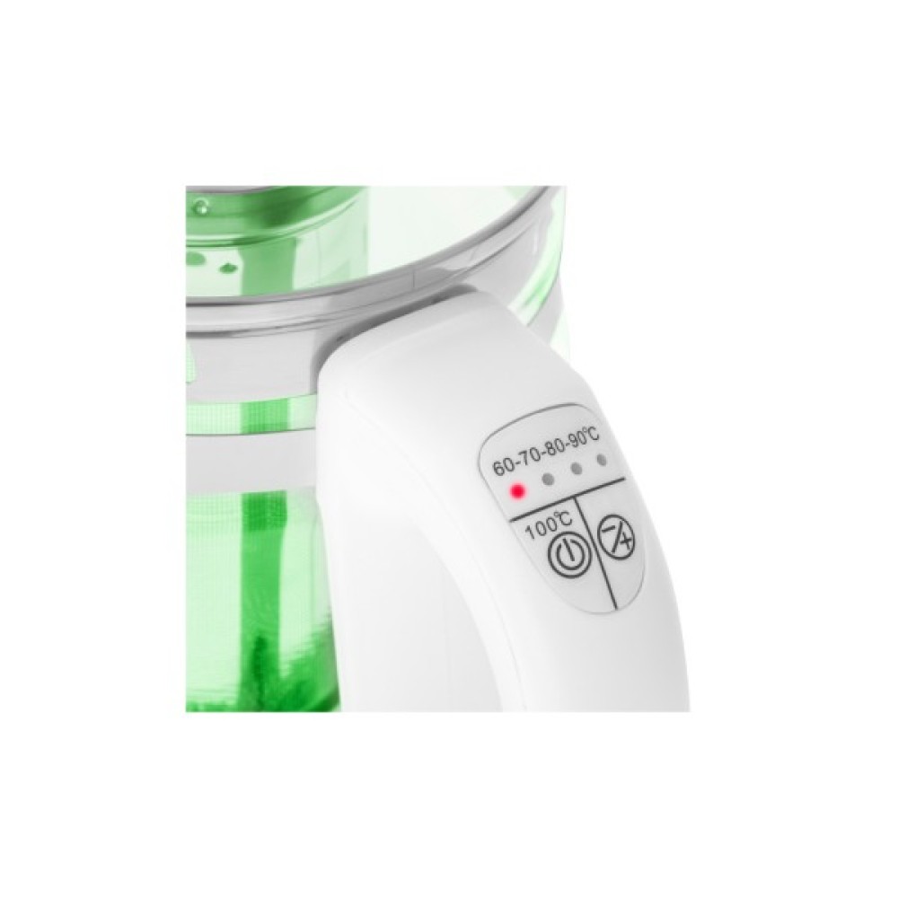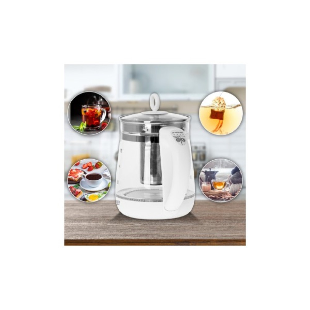 Корпус чайника виготовлений із міцного боросилікатного скла, яке не тільки додає елегантності, але й забезпечує стійкість до плям та механічних пошкоджень. Вбудований терморегулятор дозволяє точно налаштувати температуру нагрівання води на 60°C, 70°C, 80°C, 90°C або 100°C, що робить його ідеальним вибором для приготування не лише класичного чаю, але й більш делікатних напоїв, таких як зелений чай або мате.