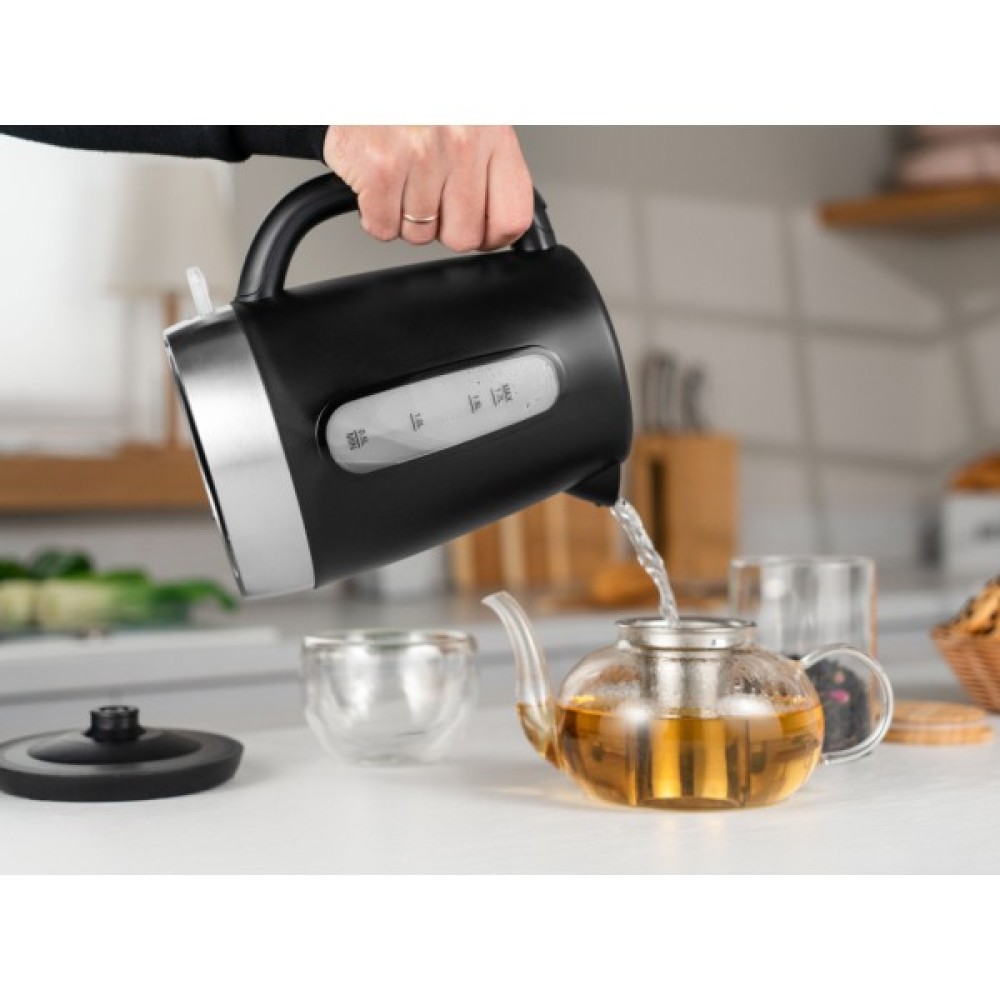 З об’ємом 1.7 літра, цей електрочайник дозволяє швидко приготувати гарячі напої для усієї родини чи великої компанії друзів. Потужність у 2150 Вт забезпечує швидке закипання води, економлячи ваш час та ресурси. Корпус чайника оснащено зовнішнім індикатором рівня води, що дозволяє контролювати кількість рідини всередині, а зйомний фільтр від накипу запобігає потраплянню частинок накипу у вашу чашку.