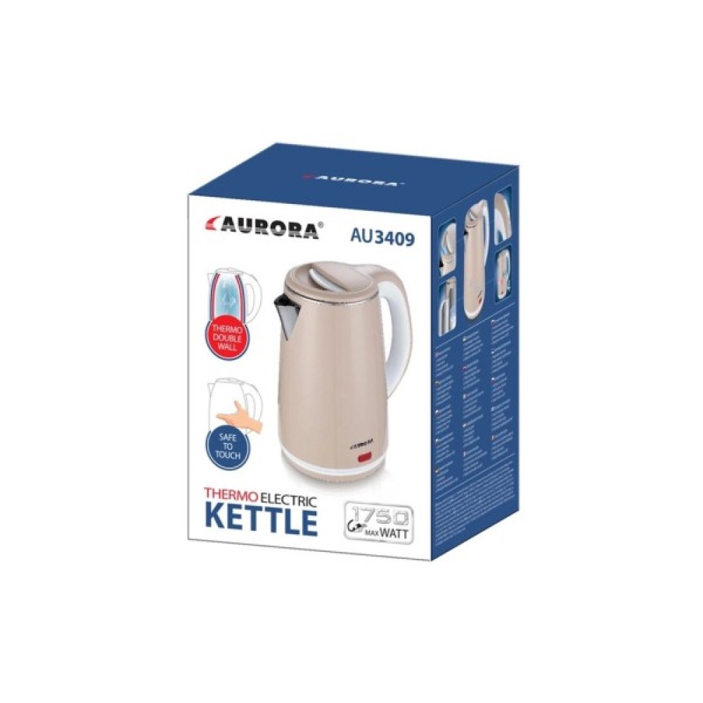 Aurora AU3409 витриманий у вишуканому бежевому кольорі, що додає йому елегантності та пасуватиме до будь-якого інтер’єру. Чайник працює на напрузі 220В і частоті 50 Гц, адаптуючись під стандартні електромережі.