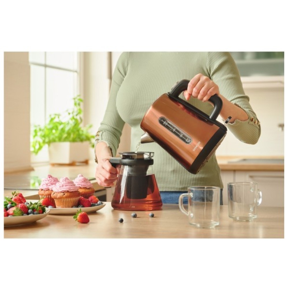 Корпус електрочайника виготовлено з високоякісної нержавіючої сталі SUS 304, що не тільки надає йому сучасного вигляду, але й забезпечує тривалу експлуатацію без корозії. Оригінальний бронзовий колір додасть вашій кухні ексклюзивного шарму.