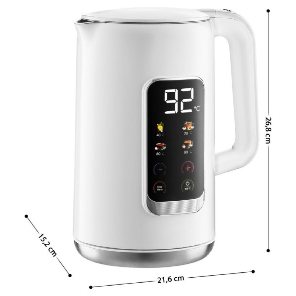 Одна з найунікальніших функцій Sencor SWK0950WH — це терморегулятор із сучасним цифровим дисплеєм, що дозволяє встановлювати необхідну температуру з точністю до градуса: 40, 70, 80, 90 і 100°C. Це особливо корисно для приготування різних видів чаю, кави чи дитячого харчування, зберігаючи смакові властивості кожного напою. Функція підтримки тепла дозволяє зберігати температуру води, щоб насолоджуватися гарячими напоями тоді, коли вам це зручно.