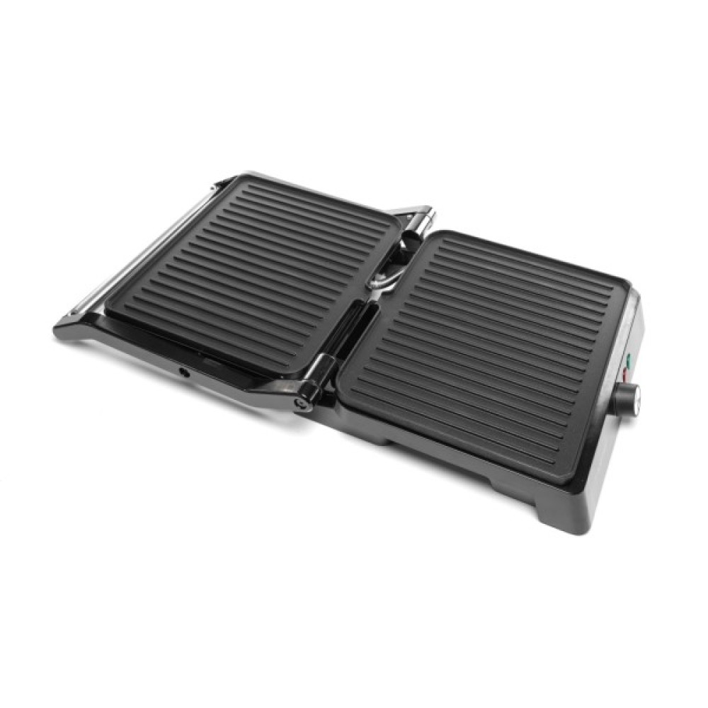 Гриль оснащений регулятором температури, який дозволяє налаштовувати нагрів від 140° до 210° С. Це дозволяє обирати оптимальний режим для різних типів продуктів. Притискна ручка з термоізоляцією забезпечує безпеку під час використання.