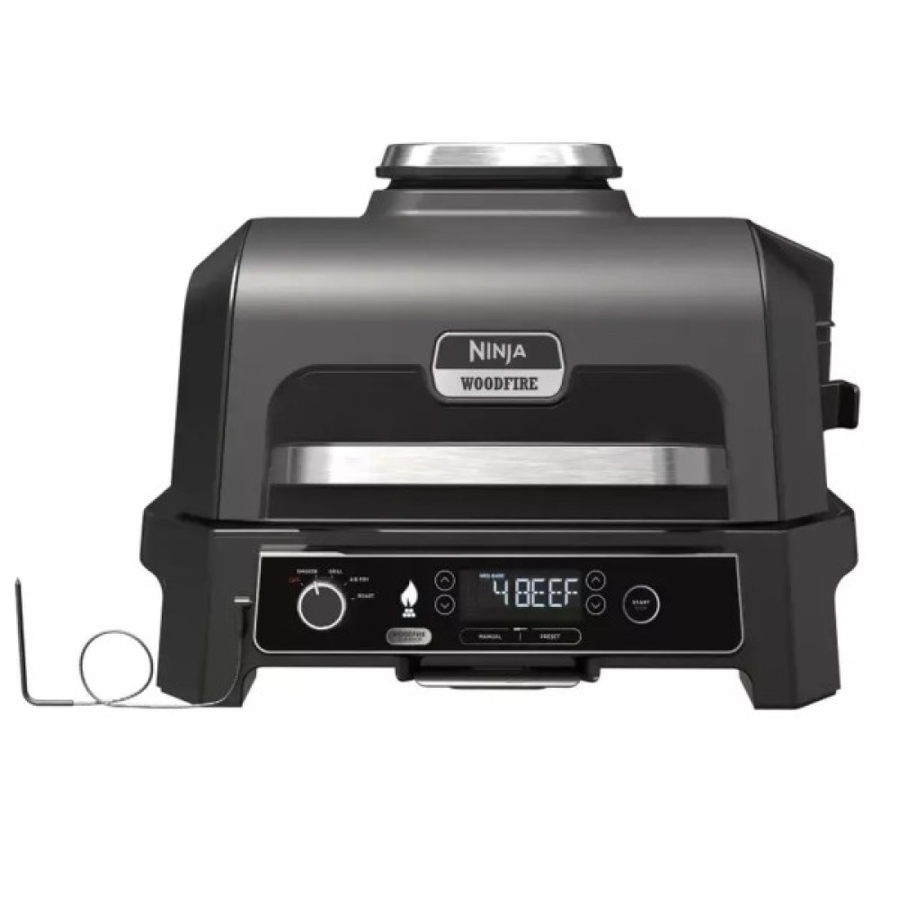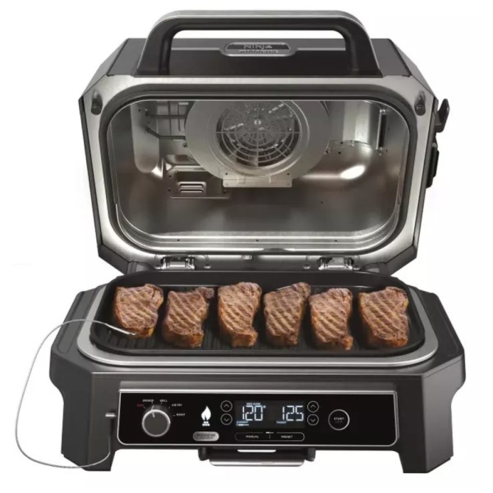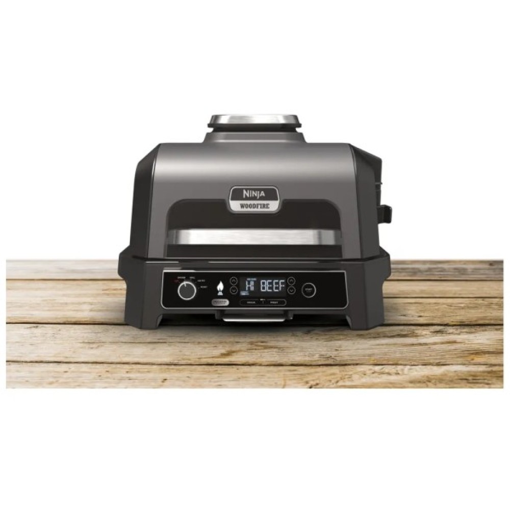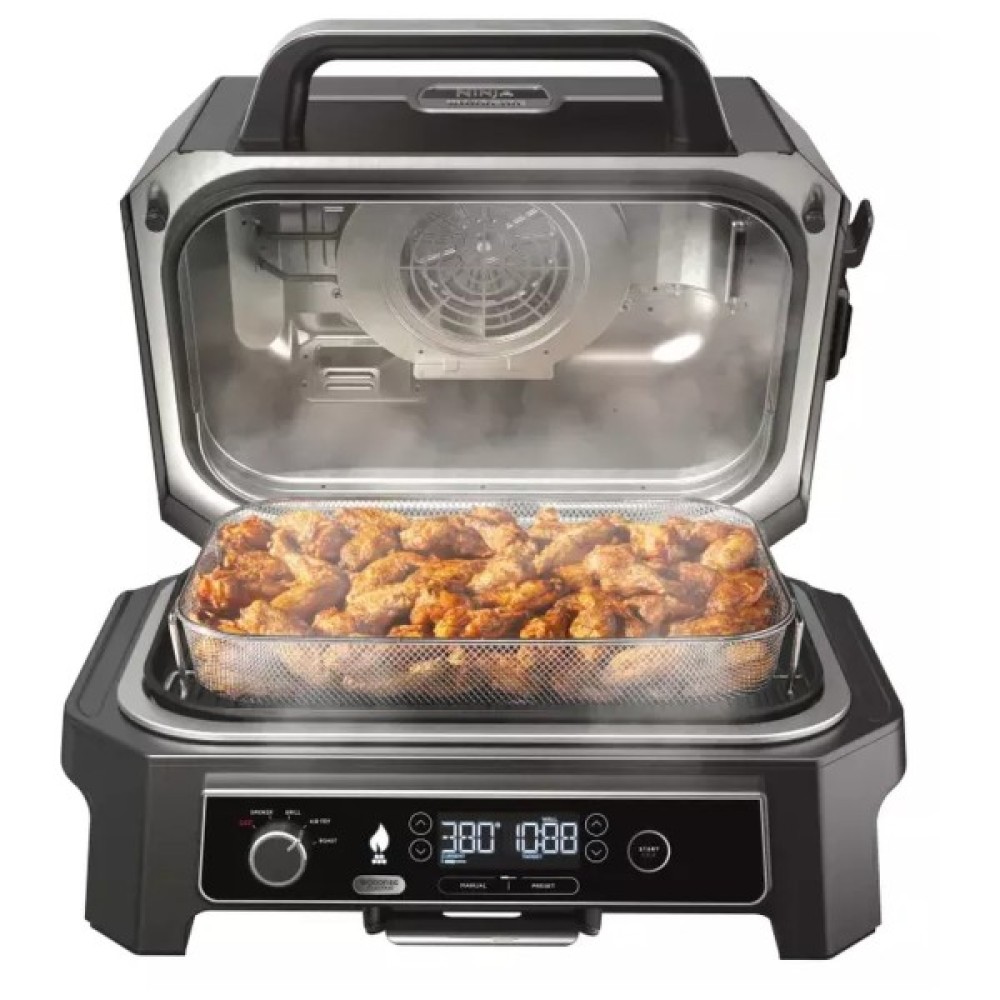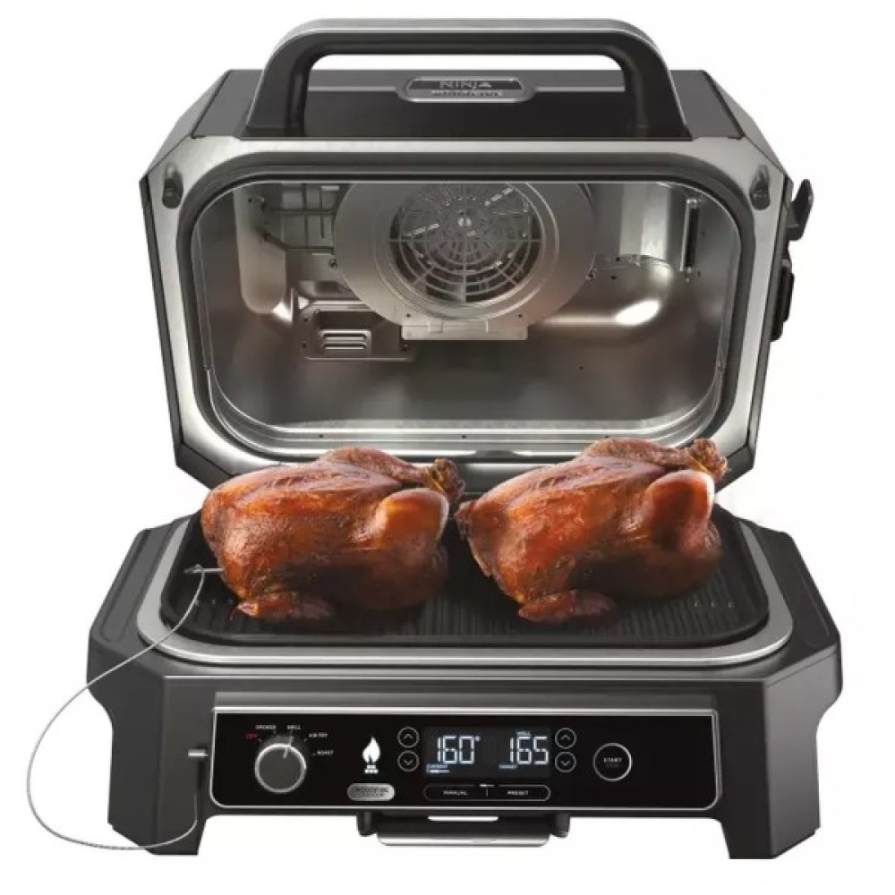 Електричний барбекю-гриль Ninja швидко нагрівається, стійкий до погодних умов і дарує улюблений копчений смак зі 100% натуральними гранулами Woodfire!