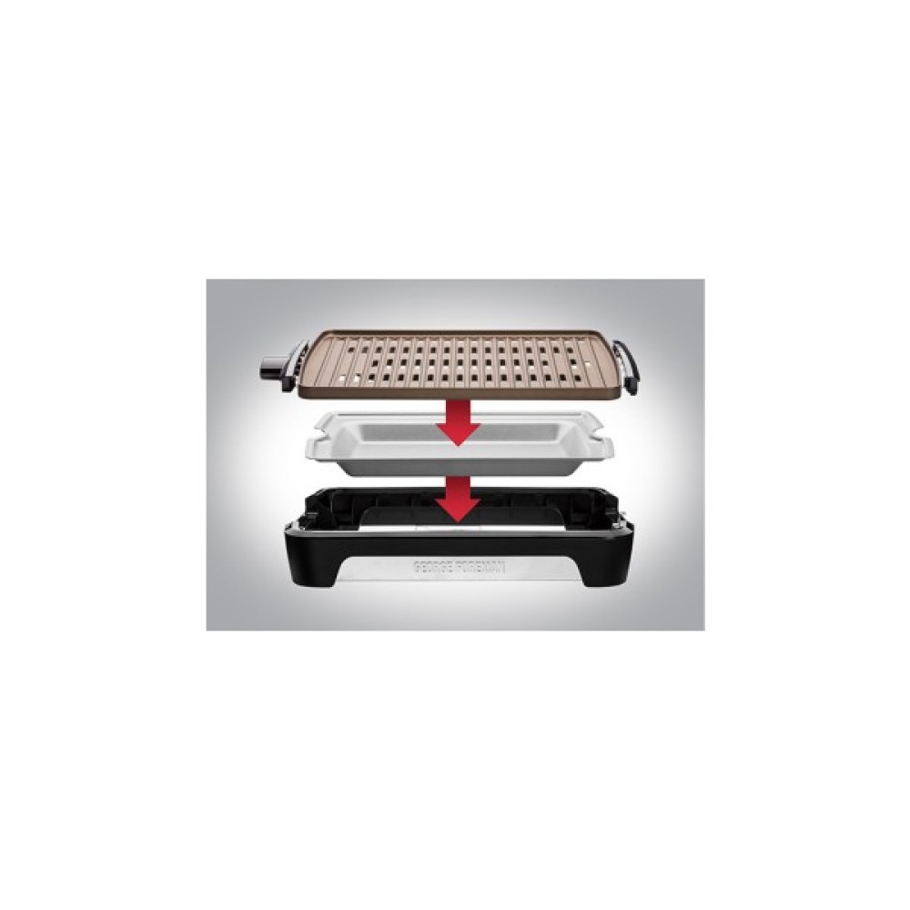 Бездимна технологія усуває до 80% диму. Пластина для гриля призначена для спрямування гарячого жиру в піддон для збору крапель, який знаходиться під ним, миттєво охолоджує його і усуває загоряння, що викликає дим і запах. Чистка гриля ніколи не була такою простою. В пластині гриля для барбекю використовується провідне в галузі антитипригарного титанового покриття, яке не тільки робить гриль в 3 рази більш довговічним, але і безпечним для миття в посудомийній машині. Ідеально підходить для розваг розмір. Будь то побачення зі стейком, гамбургери з друзями або вегетаріанський сніданок - цей гриль-барбекю без диму подбає про кожного ваше бажання. Положення пластин: Барбекю, Гриль. Площа приготування: 1109 см². Сталевий корпус і пластикові деталі. Внутрішній піддон і плиту можна мити в посудомийній машині.