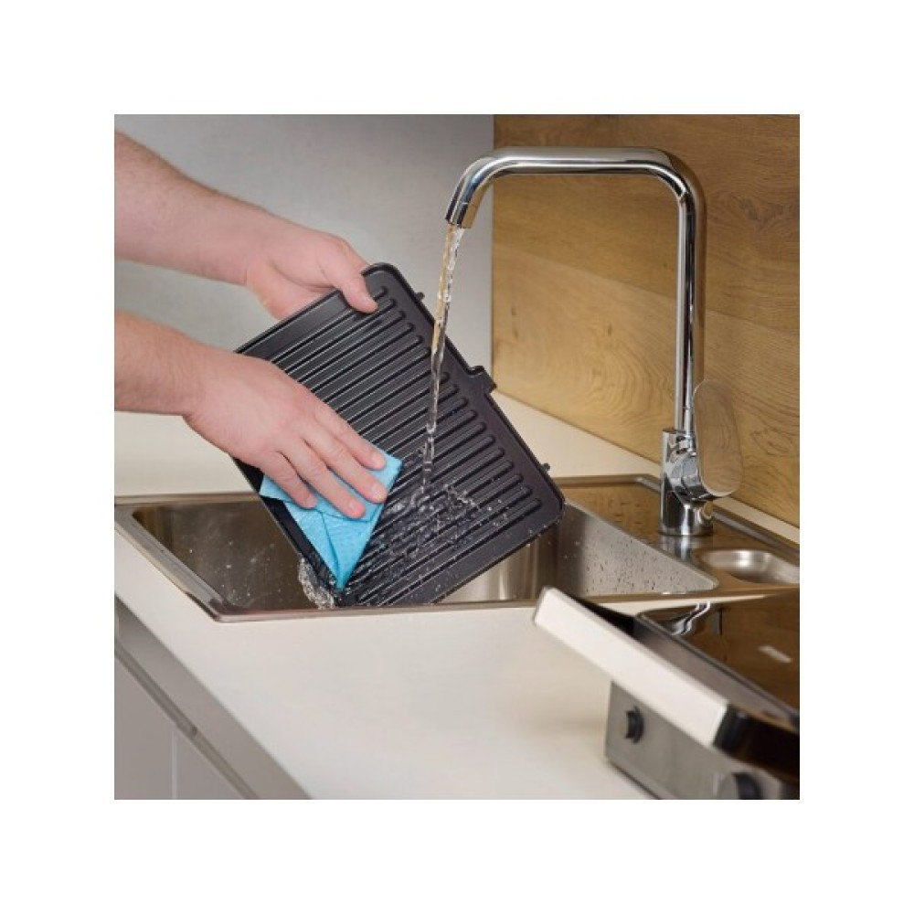 Знімні пластини гриля значно полегшують догляд. Після використання їх можна просто зняти та очистити за кілька хвилин. Завдяки антипригарному покриттю залишки їжі легко видаляються вологою серветкою або губкою.