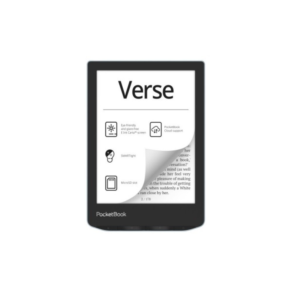 PocketBook Verse — ідеальний компаньйон для завзятих читачів. Завдяки 6-дюймовому сенсорному HD екрану E Ink Carta™ читати зручно та приємно. Високоякісний дисплей дарує комфорт, максимально подібний до читання з паперу, забезпечуючи години читання без напруги очей чи втрати концентрації. Попрощайтеся з відблисками на яскравому сонячному світлі, адже E Ink дисплей рідера дозволяє читати будь-де та будь-коли. Його ідеальна чіткість і читабельність немов оживляють кожне слово на сторінці.