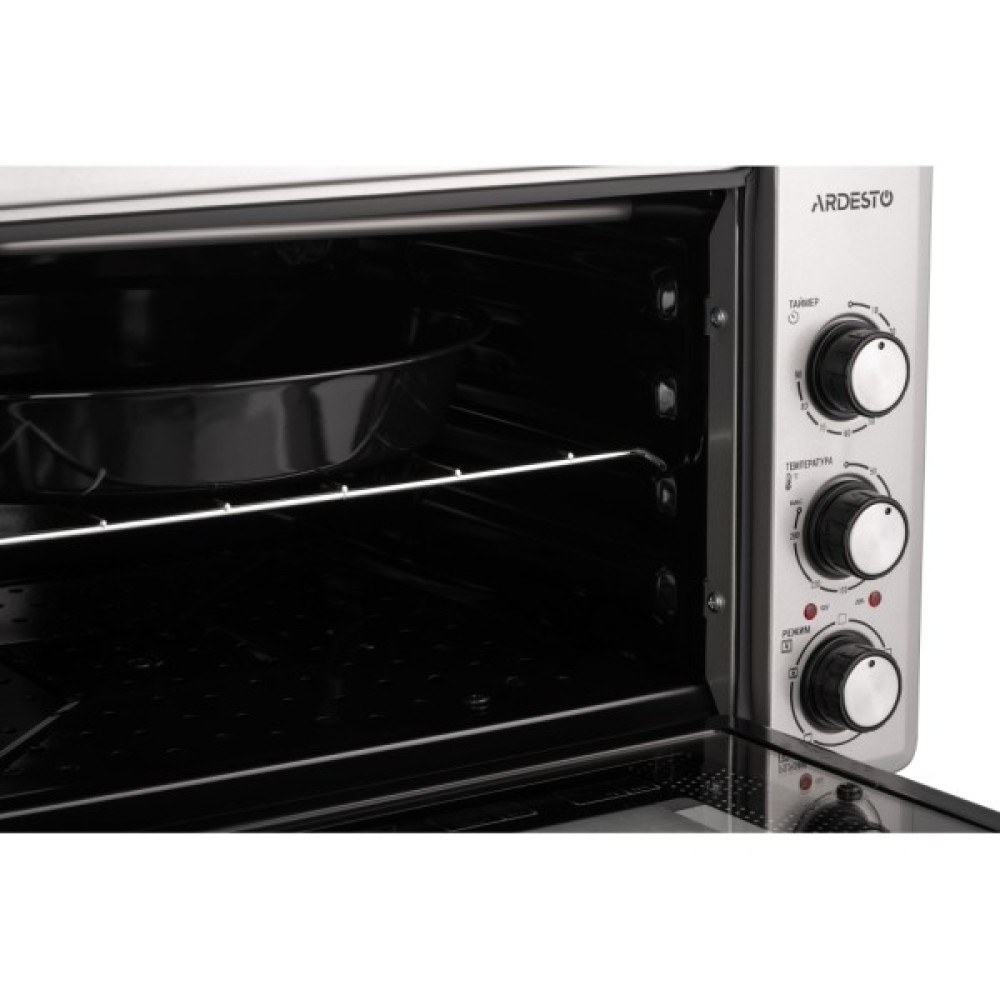 Електрична піч ARDESTO сірого кольору стане в пригоді чи не на кожній кухні. Для створення різноманітних кулінарних шедеврів передбачено чотири програми приготування, а в комплекті постачання є два дека (кругле та прямокутне) та решітка для гриля. Щодо безпеки: модель має подвійні дверцята із загартованого скла та нековзкі ніжки для стійкості печі.