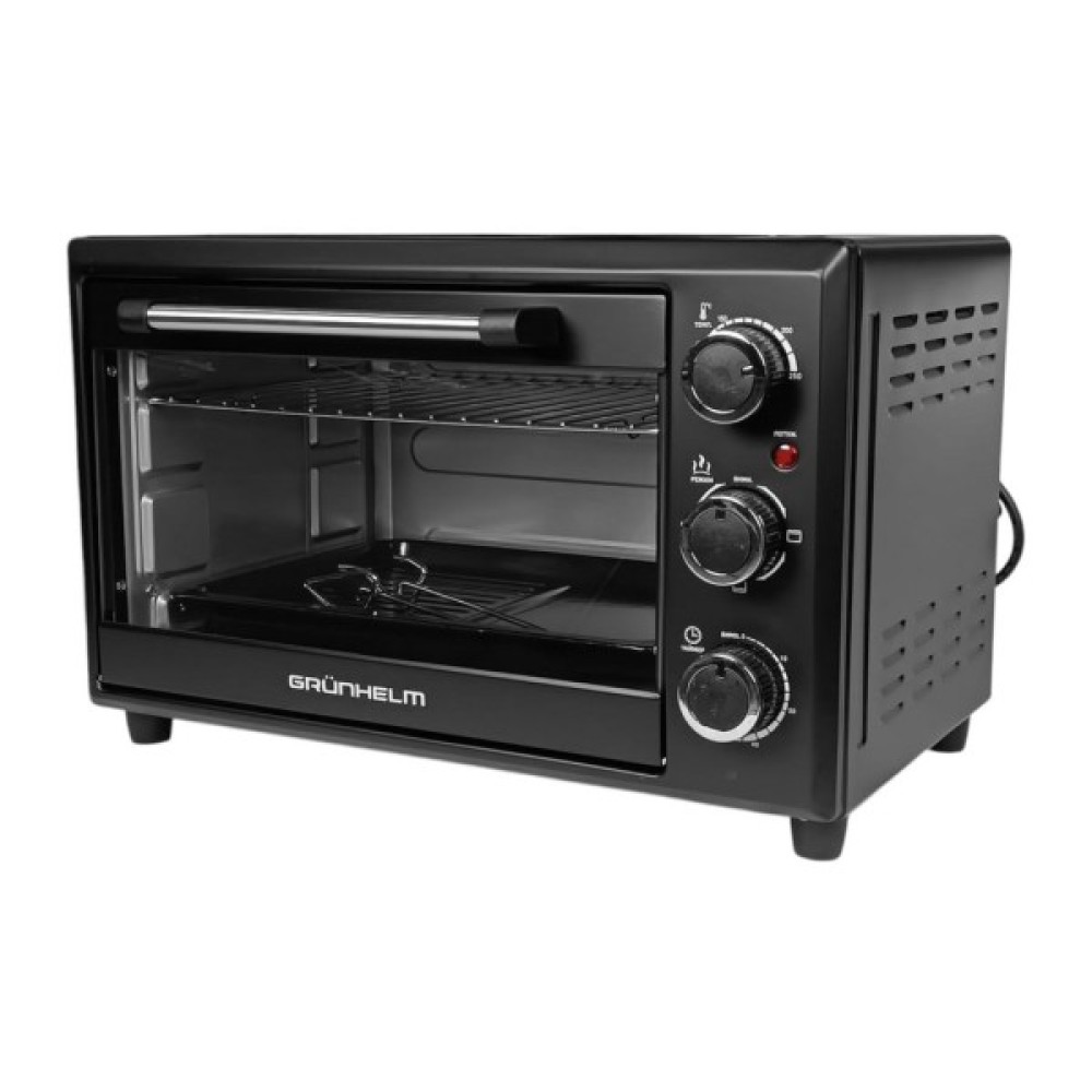Електрична піч з грилем - для нагріву температури в якій вбудовані спеціальні нагрівальні елементи (ТЕНи), які розташовані у верхній і нижній частинах печі. Наявність потовщених стінок знижує споживання електроенергії в процесі приготування. Внутрішнє і зовнішнє виконання печі виконані з емальованої сталі. Вбудований таймер спростить процес готування і вчасно оповістити вас про готовність вашого страви звуковим сигналом. Наявність спеціальних знімних ручок (рогачі) для вилучення решітки для гриля і дека зробить ваш процес готування максимально комфортним. Електропіч, завдяки своїм невеликим розмірам ідеально увіллється в обстановку, де необхідно зберегти максимум простору, як на невеликій за площею кухні в міській квартирі, або в заміському будинку.