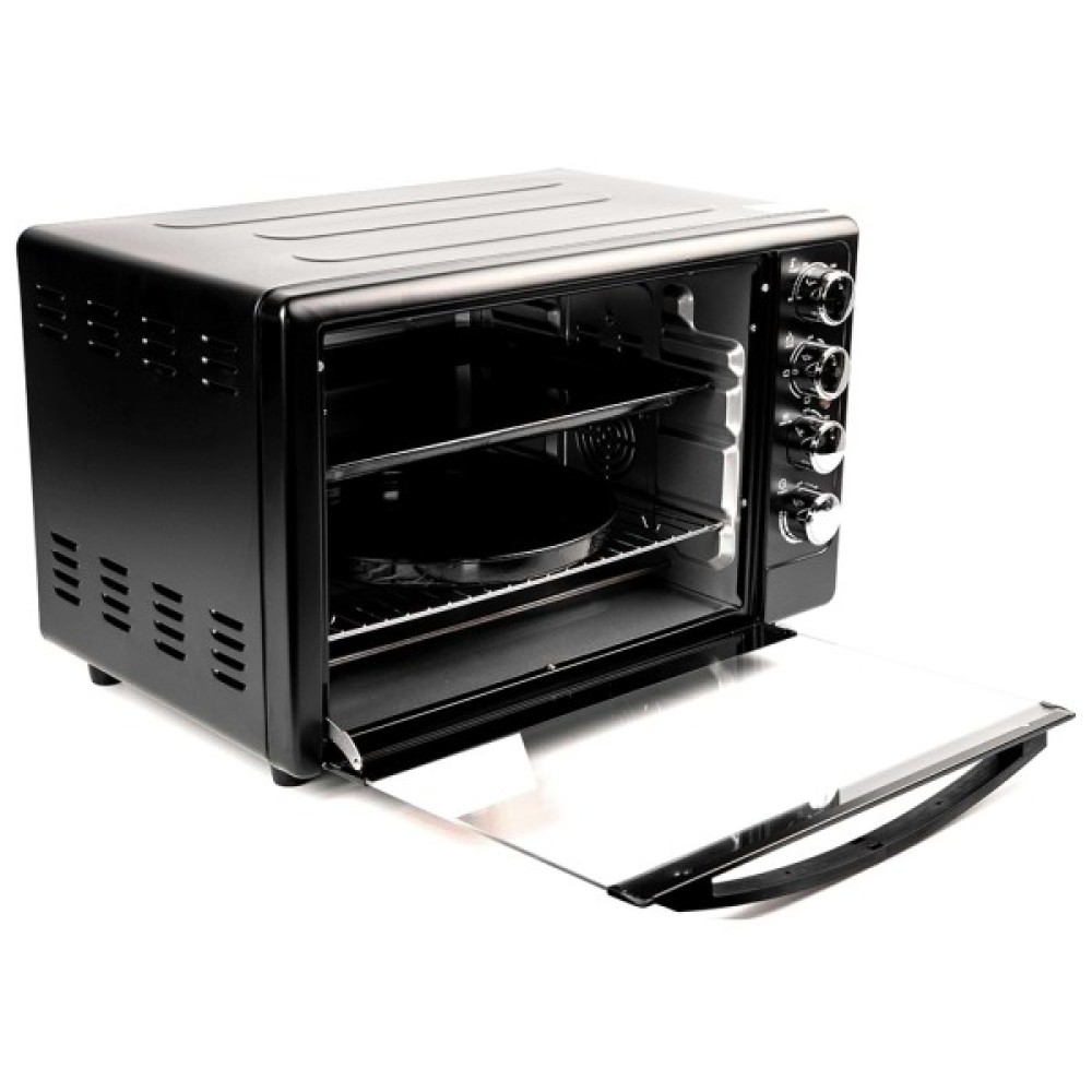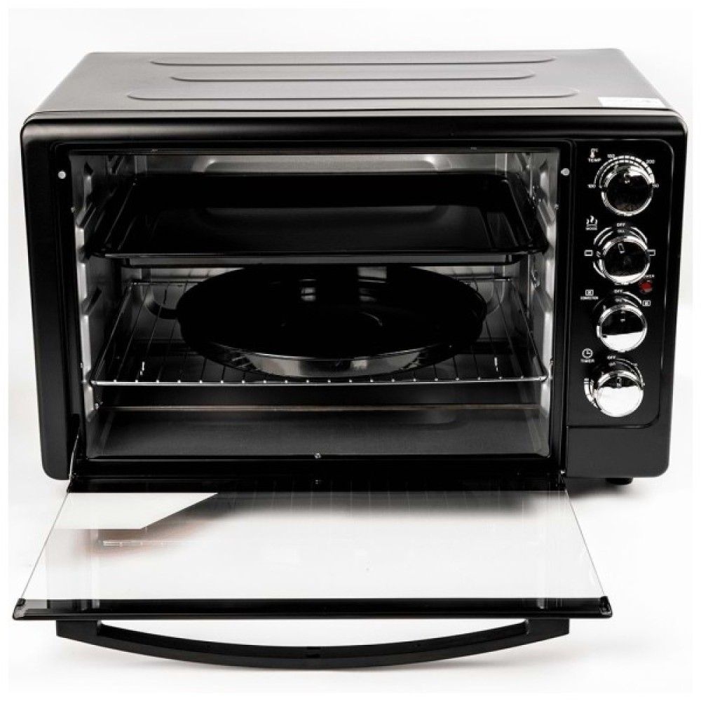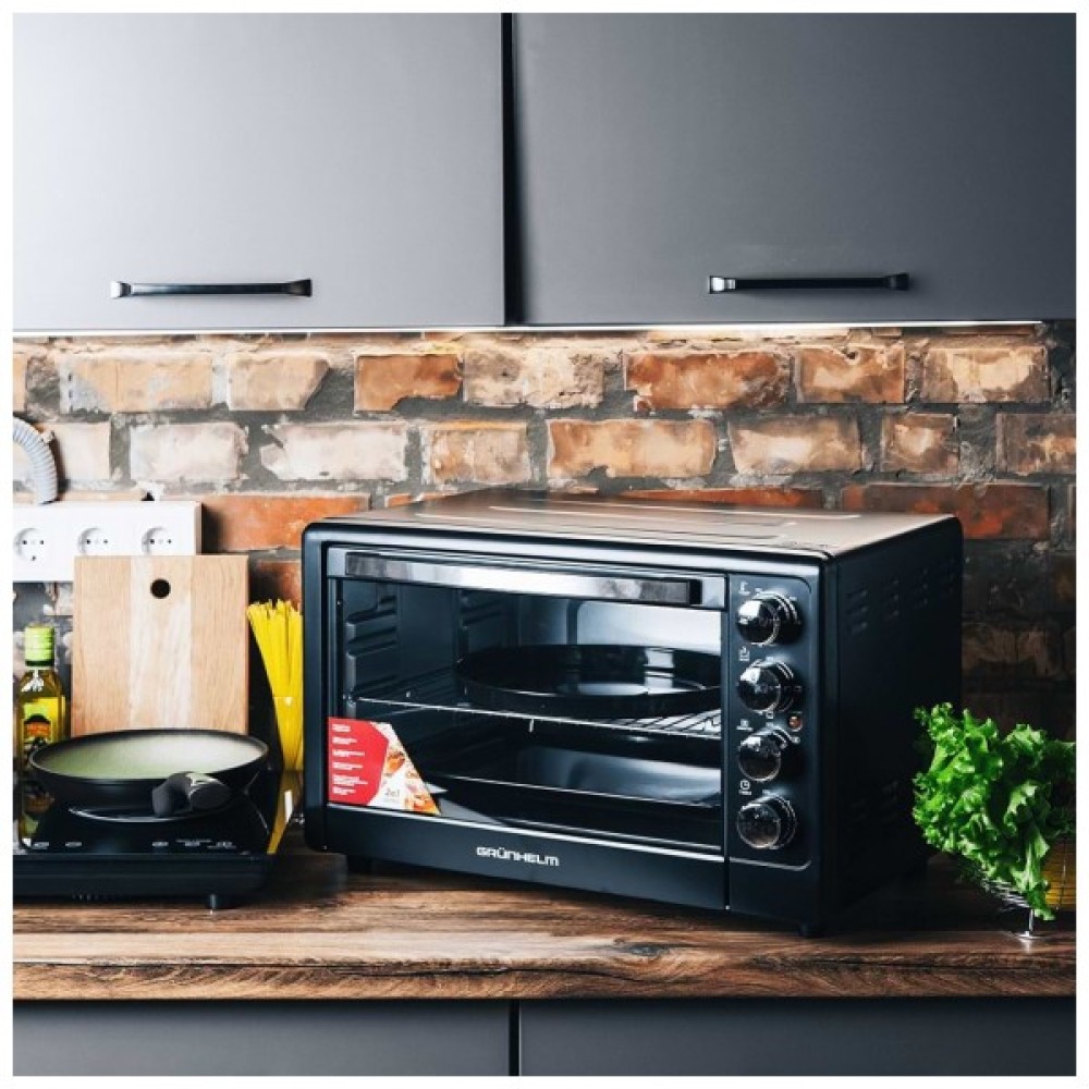Електрична піч Grunhelm GN50AC має вельми об'ємну камеру, яка здатна вмістити в себе великі страви - 50 л. Загальний дизайн ергономічно продуманий і залишається класичним, тому впровадити таку піч на кухню буде нескладно. Габарити корпусу 41 x 58.3 x 37 см. Оформлення в чорному кольорі з хромованими елементами - базовий варіант, який вітається в будь-якій кухні. Механічні регулятори управління представлені чотирма поворотними перемикачами, які мають зрозумілий інтерфейс.