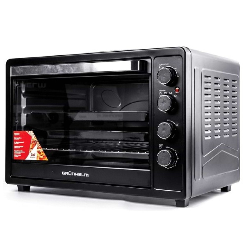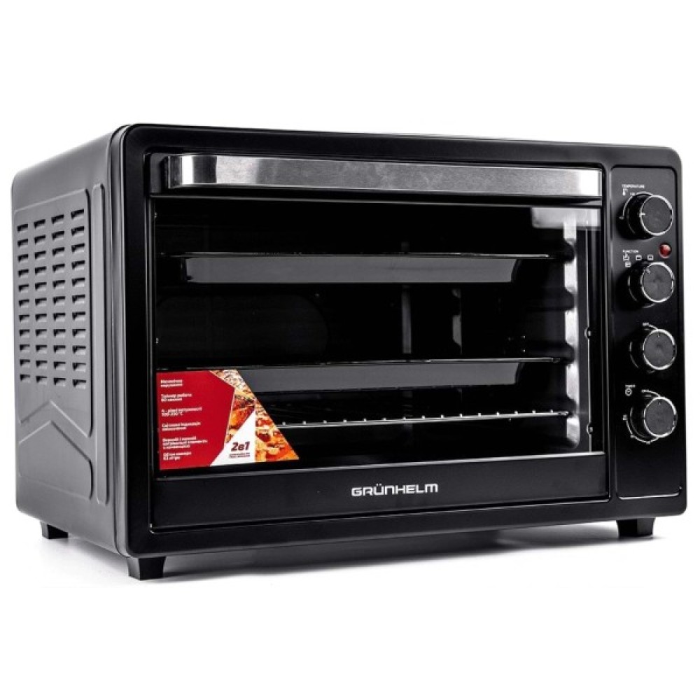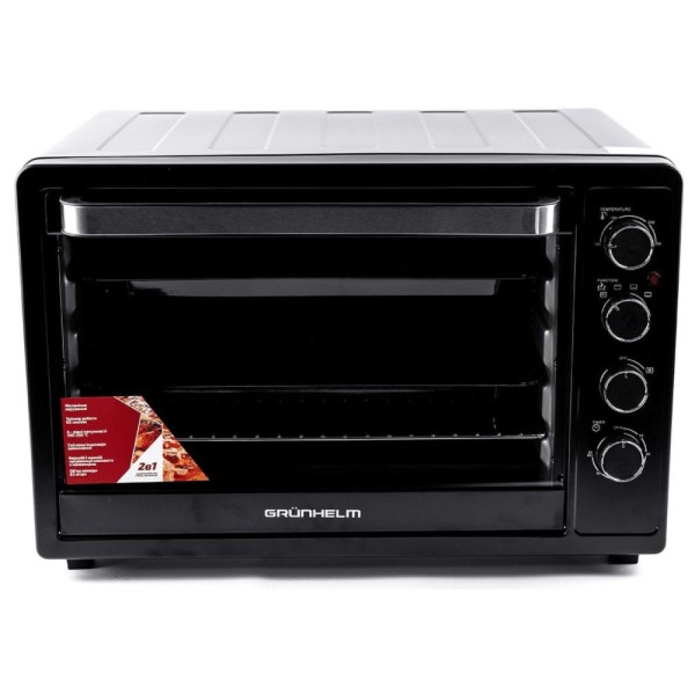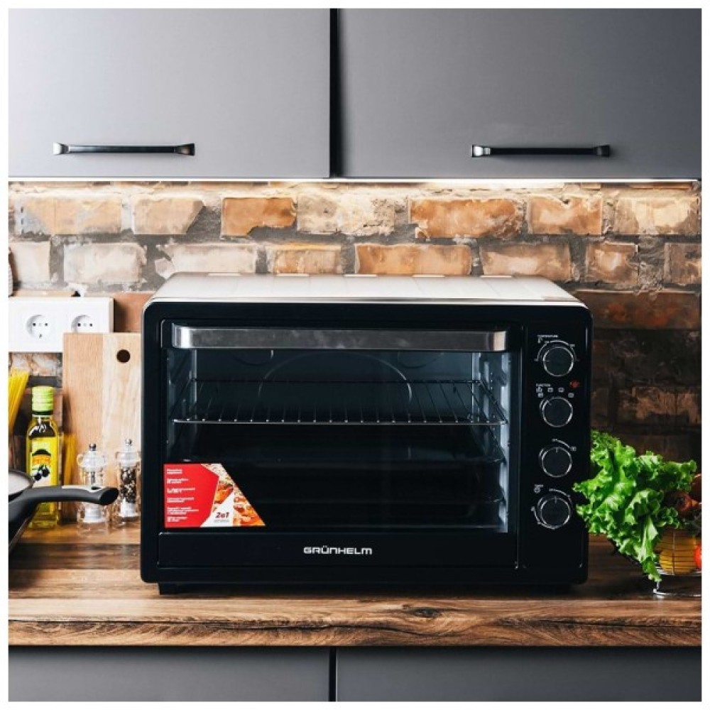 Міні-піч Grunhelm GN63СВ сміливо можна назвати повноцінною духовою шафою. При скромних розмірах, відсутності необхідності вбудовування та невеликій ціні, її внутрішній об'єм 63 літри, що можна порівняти з класичною кухонною технікою. Електрична піч Grunhelm GN63СВ не обладнана зовнішніми конфорками і її верхню частину цілком можна використовувати в якості підставки для іншої техніки, посуду або елементів декору. Стильний чорний колір універсальний, підходить будь-якому колірному рішенню кухонного гарнітура.