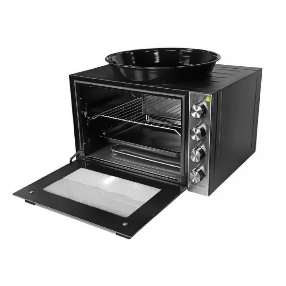 Електрична піч Grunhelm GN70KASС виконана у корпусі чорного кольору. Потужність пристрою становить 2500 Вт, а ступінь нагрівання встановлюється плавним регулюванням. У 70-літровій камері моделі встановлені гриль та конвекційний вентилятор. Функція гриль утворює на продуктах хрумку ароматну скоринку.