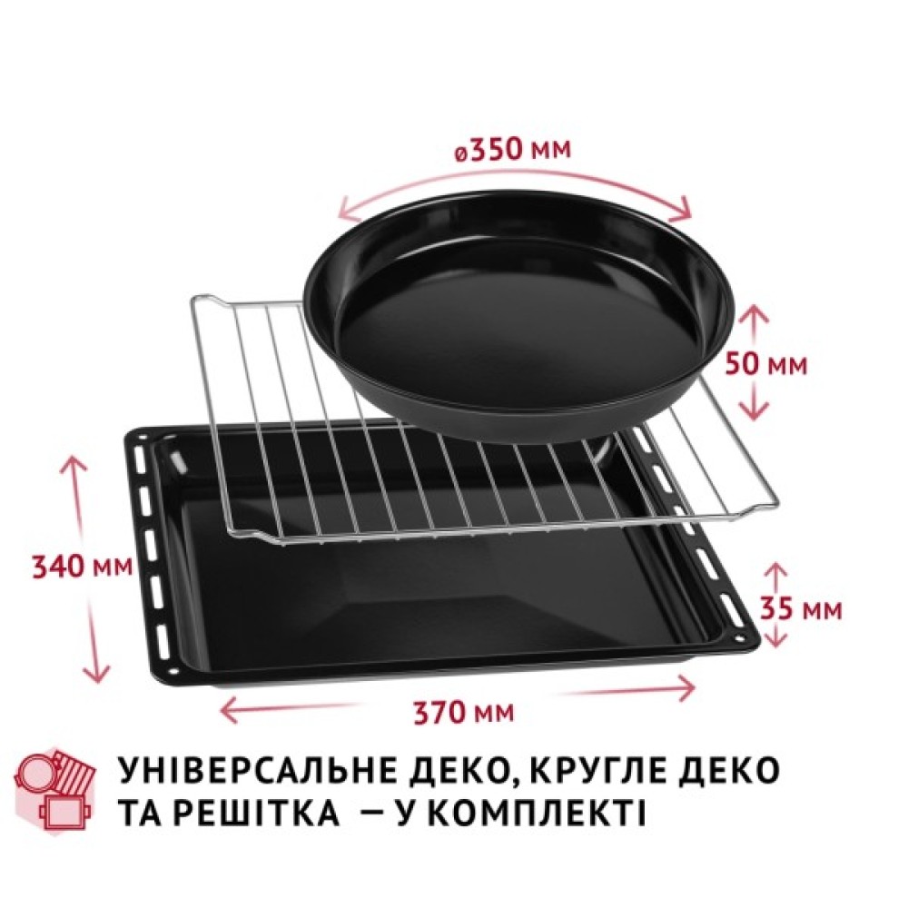 Надійне механічне керуванняУправління піччю здійснюється за допомогою механічних поворотних перемикачів, що дозволяє легко та безпечно обирати режим, налаштовувати температуру та час приготування.