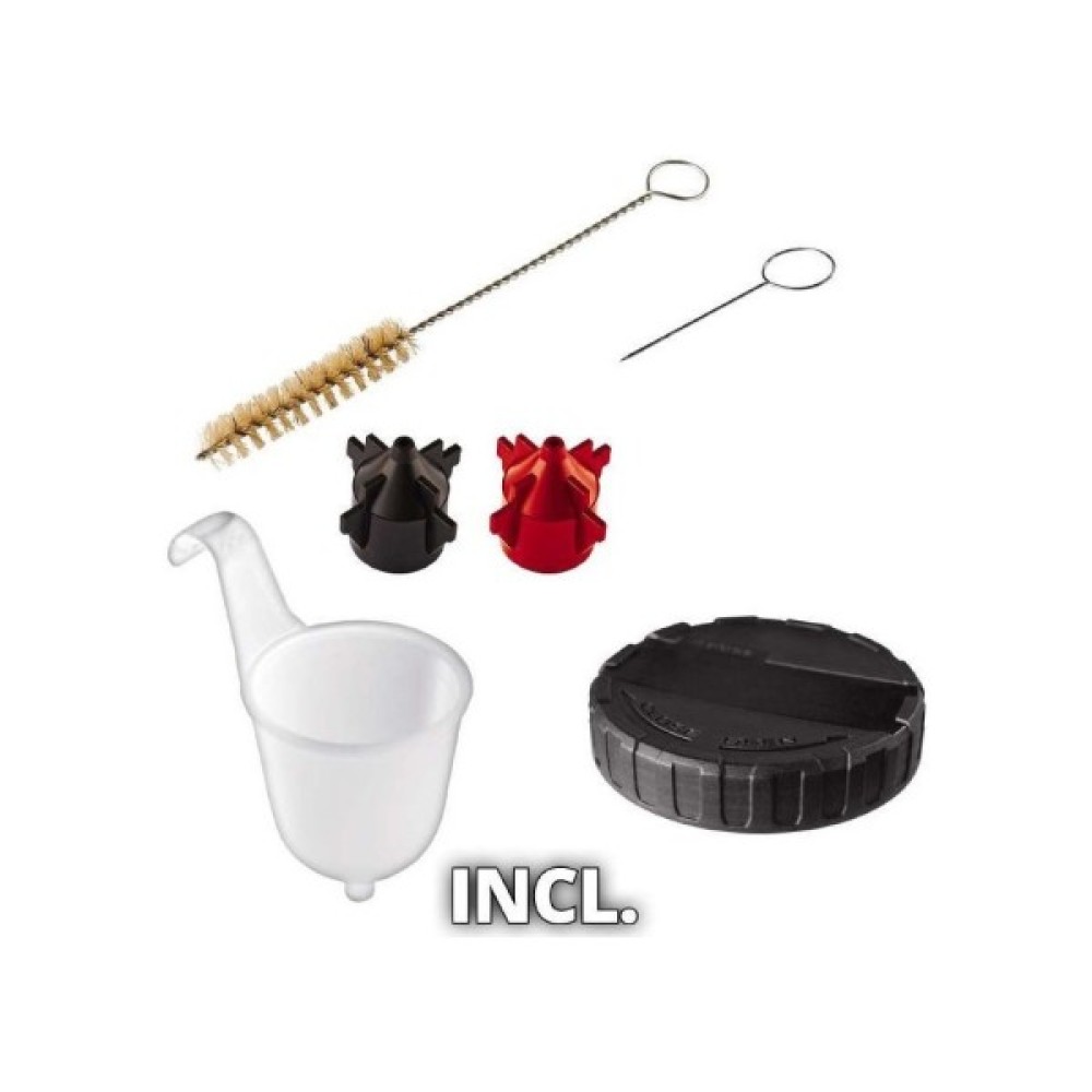 У комплект поставки входять: два сопла для різної вязкості лаку і глазурі, резервуар для проби вязкості, щітка і голка для чищення, а також бачок для фарби об'ємом 800 мл з кришкою. Поставляється без акумулятора і зарядного пристрою, вони доступні окремо.