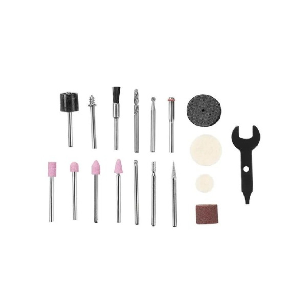 - Включає 26 різних насадок для шліфування, різання, різьблення, полірування та очищення