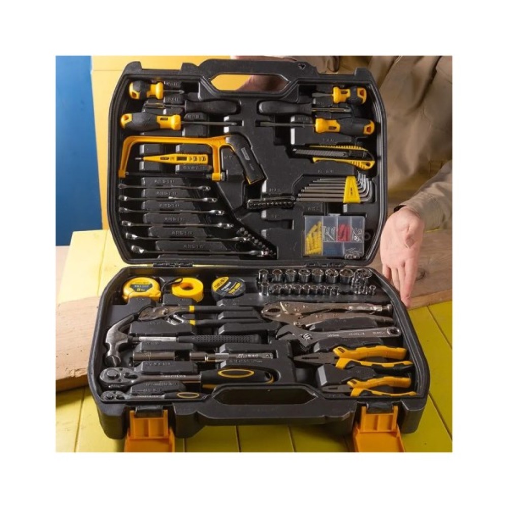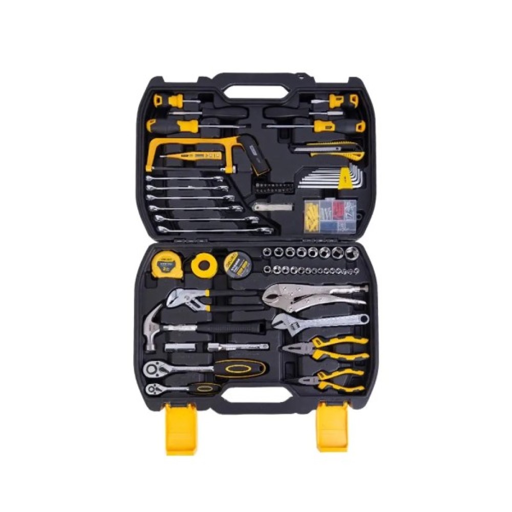 Комплектація набору шарнірно-губцевий інструмент; викрутки; торцеві головки; гайкові ключі; біти; шестигранні/зіркоподібні ключі; молоток; тримач для біт; тріскачка; подовжувач; пасатижі; розвідний ключ; рулетка; ніж; ножівка; переставні кліщі; кліщі з фікcaтopoм; довгогубці; ізострічка