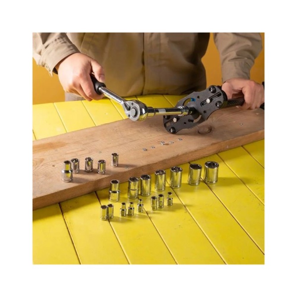 Якість кожного елемента набору гарантує довговічність та надійність під час експлуатації. Гайкові ключі, представлені у кількості шести комбінованих одиниць, забезпечують легкість у роботі з різноманітними кріпленнями. Вони виготовлені з високоміцної сталі і готові витримувати інтенсивні навантаження. Торцеві головки, 22 шт. з метричними розмірами, у поєднанні з трещіточною рукояткою та подовжувачами забезпечать зручність роботи у важкодоступних місцях. Їх робочий профіль, шестигранний, гарантує надійність захоплення і зменшує ризик пошкодження кріплень.