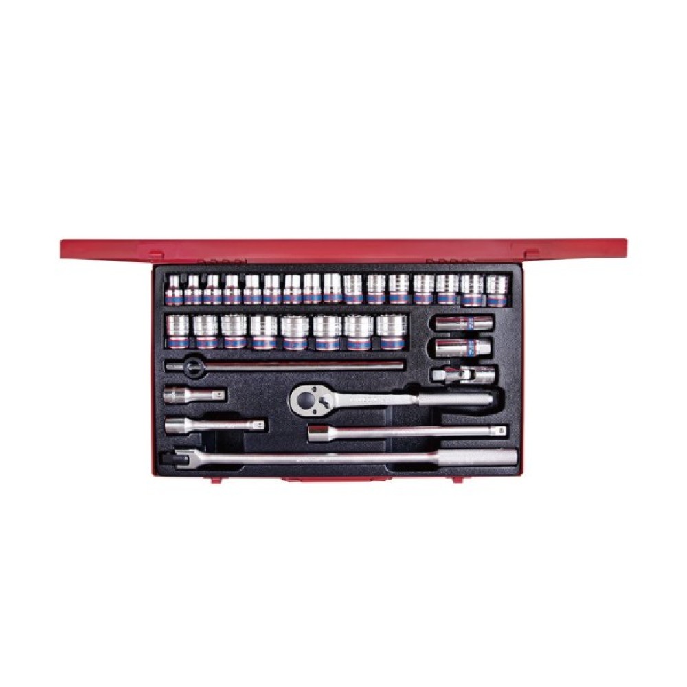 Основною перевагою цього набору є 26 шт. торцевих головок з метричною розмірністю, що відповідають найпоширенішим стандартам. Ці головки виготовлені у формі дванадцятигранника, що забезпечує надійність та точність у роботі. Їх стандартна довжина дозволяє використовувати головки у важкодоступних місцях, полегшуючи процес ремонту.