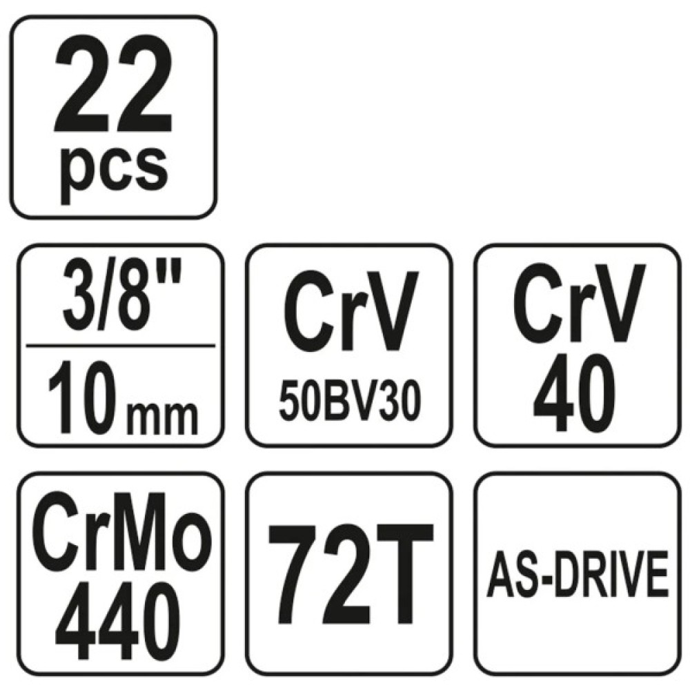 У набір входить 22 різноманітні інструменти, серед яких 17 торцевих головок з метричною розмірністю. Головки виготовлені у формі шестигранника і мають стандартну довжину, що забезпечує чудову посадку на кріплення. Серед розмірів головок представлені: 3/8" x 6, 3/8" x 7, 3/8" x 8, 3/8" x 9, 3/8" x 10, 3/8" x 11, 3/8" x 12, 3/8" x 13, 3/8" x 14, 3/8" x 15, 3/8" x 16, 3/8" x 17, 3/8" x 18, 3/8" x 19, 3/8" x 20, 3/8" x 21, 3/8" x 22.