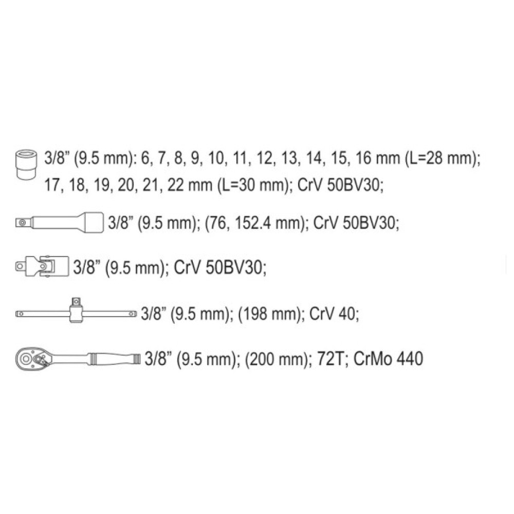 3/8": трещіточний 200 мм; 3/8": кардан; 3/8": Т-подібний 198 мм