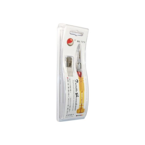 Набір Baku BK-7275 підійде для роботи в сервісних майстерень по ремонту смартфонів і іншої електронної техніки, стане в нагоді в годинниковій майстерні і вдома для підкручування дрібних гвинтиків. У набір входить 5 наконечників з різними шліцами. Три шліца TORX T4, T5, T6, які призначені для гвинтів мобільних телефонів і комп`ютерів.