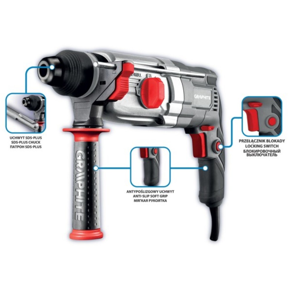 Перфоратор Graphite - це високоякісний електроінструмент, призначений для виконання різноманітних будівельних, монтажних і настановних робіт. Завдяки потужності та енергії удару він ефективно справляється з обробкою твердих матеріалів, як-от бетон, цегла, сталь і дерево. Цей перфоратор є надійним вибором для професіоналів і домашніх майстрів, які потребують потужного і багатофункціонального інструменту для виконання широкого спектра завдань.