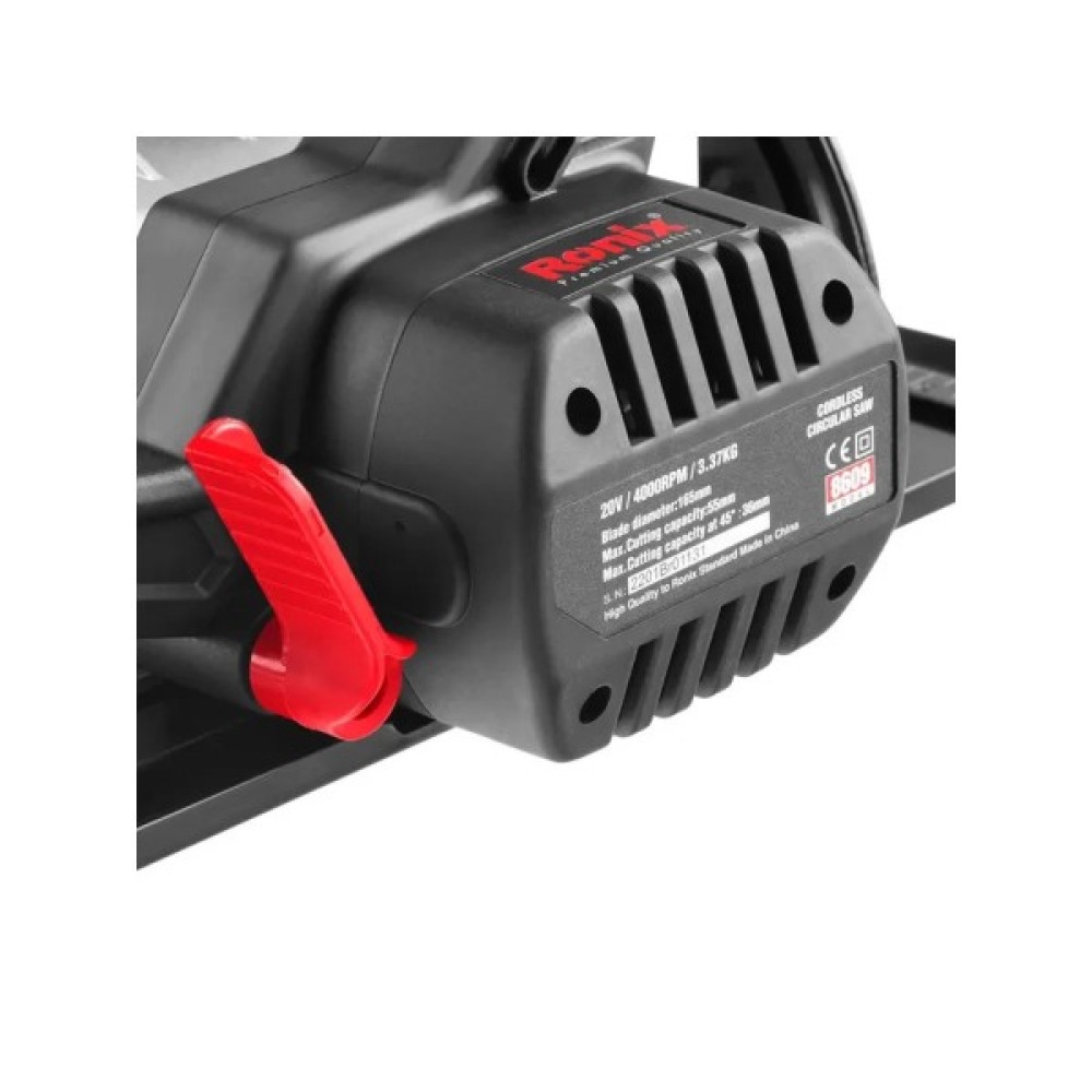 Бездротова циркулярна пила Ronix 8609 оснащена високопродуктивним двигуном на 20 В, який забезпечує швидкість холостого ходу 4000 об/хв для більшої швидкості та швидшого різання.