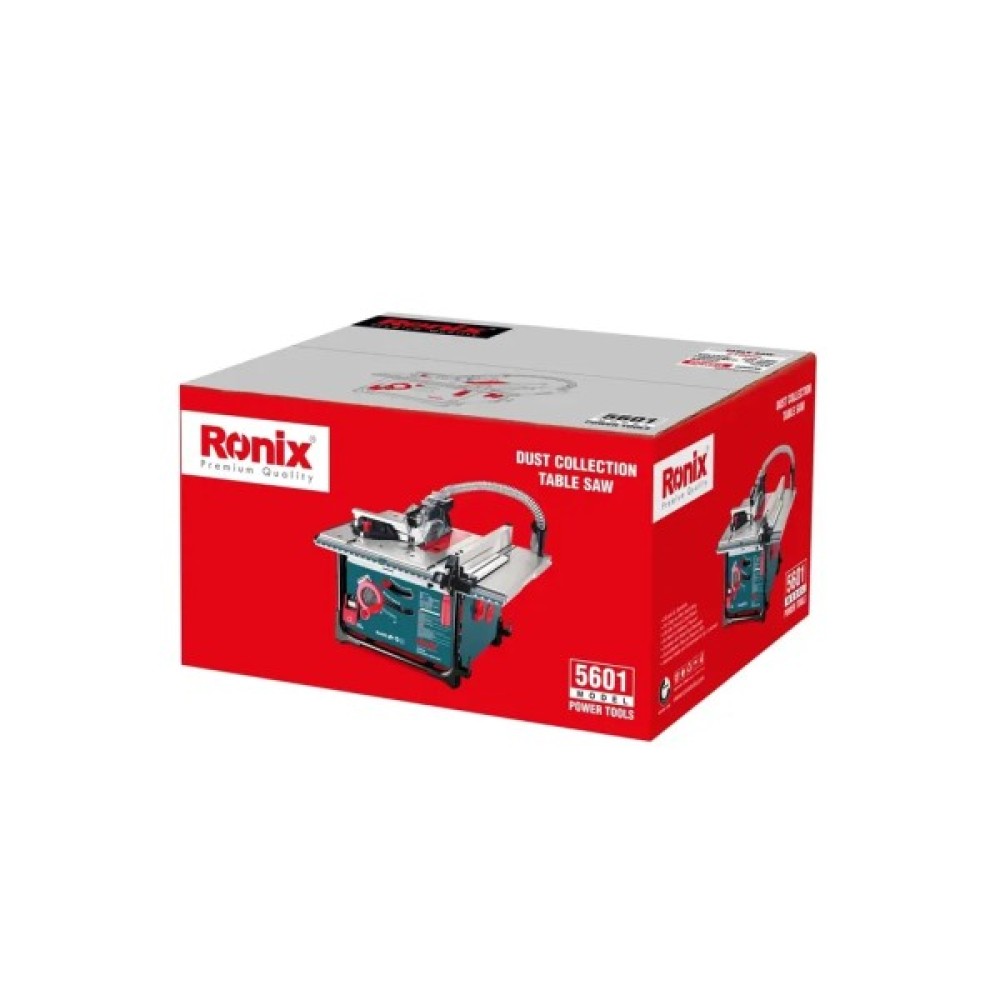 Настільна пила Ronix 5601 упакована в кольорову коробку Ronix, що містить мішок для пилу, трубку для збору пилу, напрямну планку, важіль поперечної напрямної.