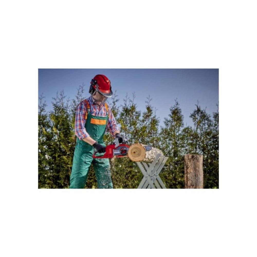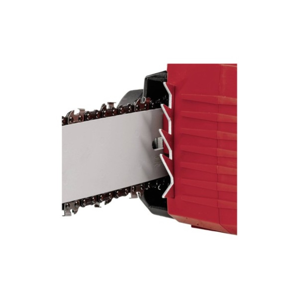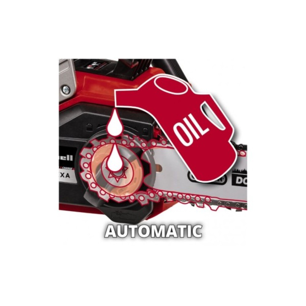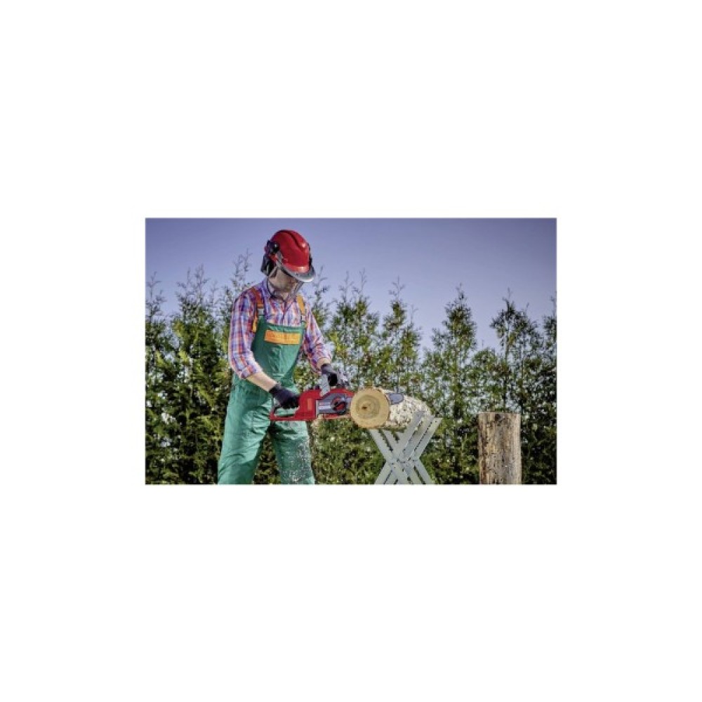 Уловлювач ланцюга та захист від віддачі з миттєвим гальмом ланцюга забезпечують безпеку під час використання. Пила має автоматичне змащення ланцюга через великий отвір для заливки масла для легкого догляду. Міцний упор виготовлений з металу, ергономічна рукоятка оснащена м’якою накладкою для міцного та надійного хвату. Швидкість ланцюга регулюється в залежності від застосування, тобто можна перемикатися між повною потужністю (8.9 м/с) і режимом Eco (6 м/с). Завдяки зниженій швидкості ланцюга термін служби акумулятора подовжується. Поставляється без акумулятора і зарядного пристрою, вони доступні окремо.