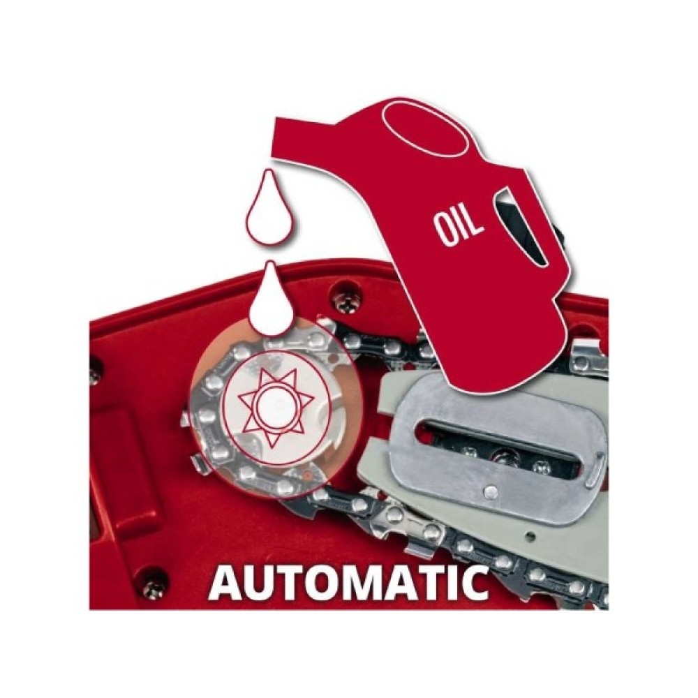 Зручна ручна пилка швидко приведе вашу домашню зелень у форму. Алюмінієва телескопічна штанга забезпечує оптимальний діапазон. Для ергономічної роботи електропила оснащена додатковою прогумованою опорою для тримання штанги. Натяг ланцюга виконується без інструментів. Ремінь для перенесення регулюється і тому ідеально адаптується для забезпечення більшого комфорту під час роботи. Інтегрований запобіжник натягу кабелю також використовується для безпеки. Масляний бак для автоматичного змащування ланцюга оснащений великим оглядовим склом для швидкого контролю рівня масла.
