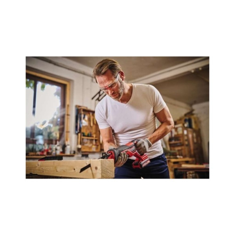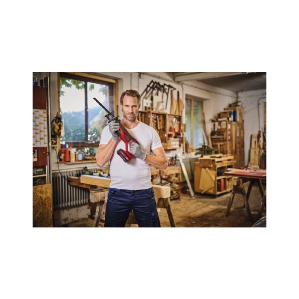 Універсальна шабельна пилка Einhell TE-AP 18/26 Li – Solo серії Expert забезпечує легку роботу з розпилювання найрізноманітніших матеріалів. Завдяки антивібраційній функції користувачі можуть працювати з інструментом комфортно і ергономічно навіть протягом тривалого часу, оскільки інструмент мінімізує вібрацію під час роботи. Підошва може регулюватися, що забезпечує оптимальне використання пиляльного полотна. Глибина пропила в деревині 180 мм, сталі до 12 мм. Електронний курок шабельної пилки дозволяє регулювати обороти двигуна в залежності від ступеня натискання. Пиляльне полотно можна швидко замінити без інструментів. Для комфортної та безпечної роботи передбачена велика м'яка зона захоплення, завдяки якій універсальна пилка завжди зручно та надійно лежить у руці. Пильне полотно по дереву KWB входить у комплект поставки. Інструмент поставляється без акумулятора та зарядного пристрою, але може бути приведений у дію за допомогою акумулятора Power X-Change.