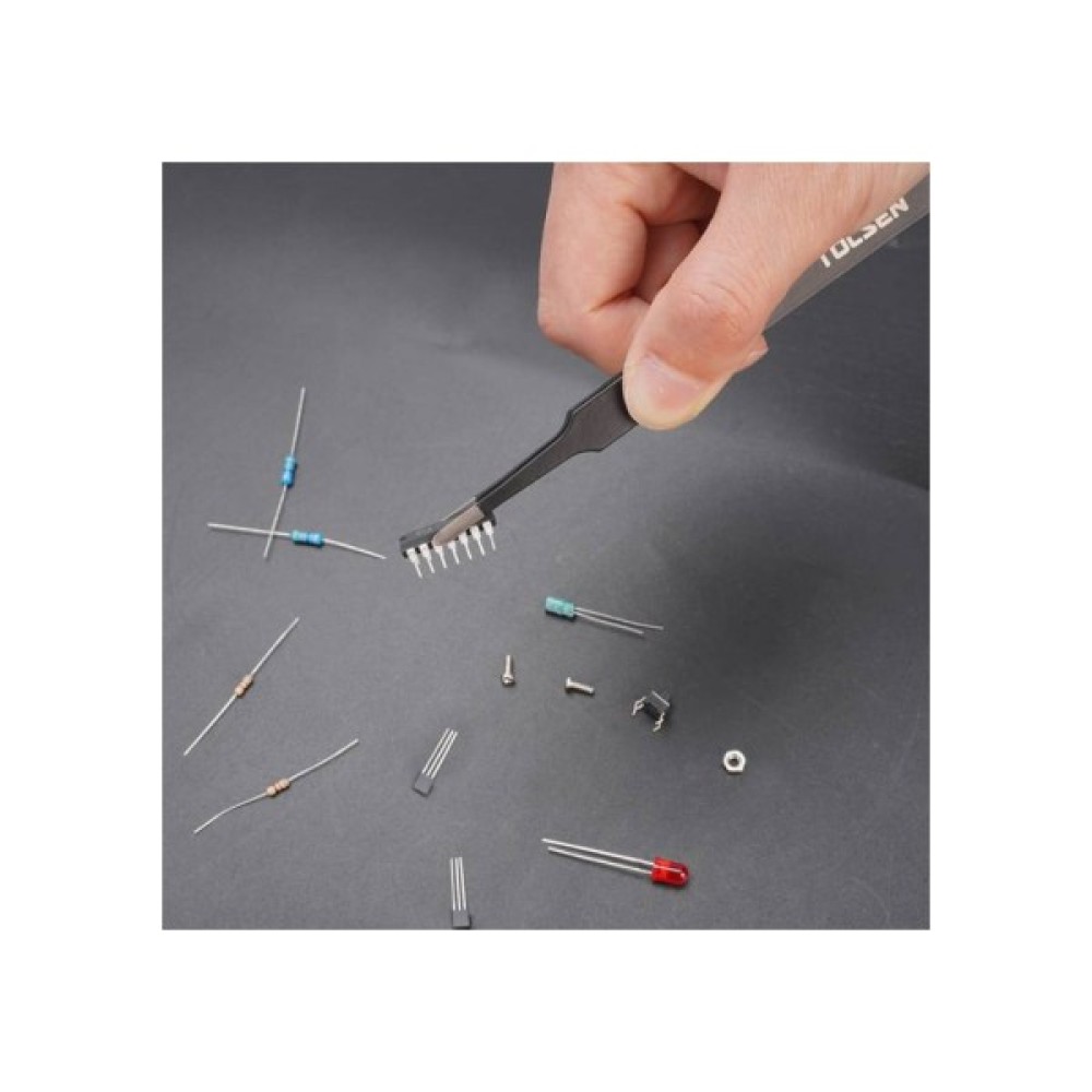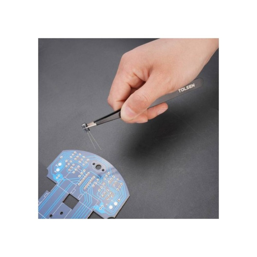 Комплект Tolsen включає 3 пінцети з нержавіючої сталі, кожен із яких має антистатичне покриття для безпечної роботи з електронними компонентами та дрібними деталями. Пінцети зручні у використанні, забезпечують точність захвату та довговічність навіть при інтенсивній роботі. Ідеальний набір для електроніки, ювелірних та ремонтних робіт.