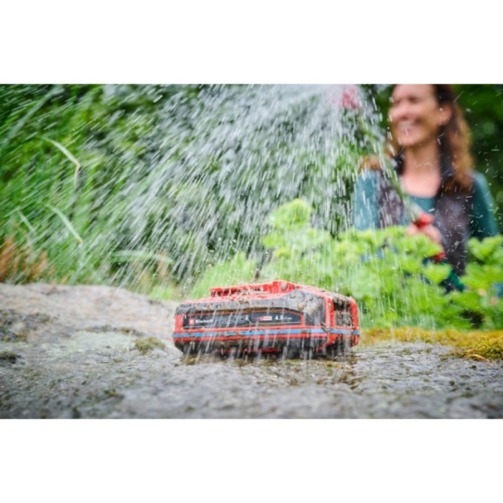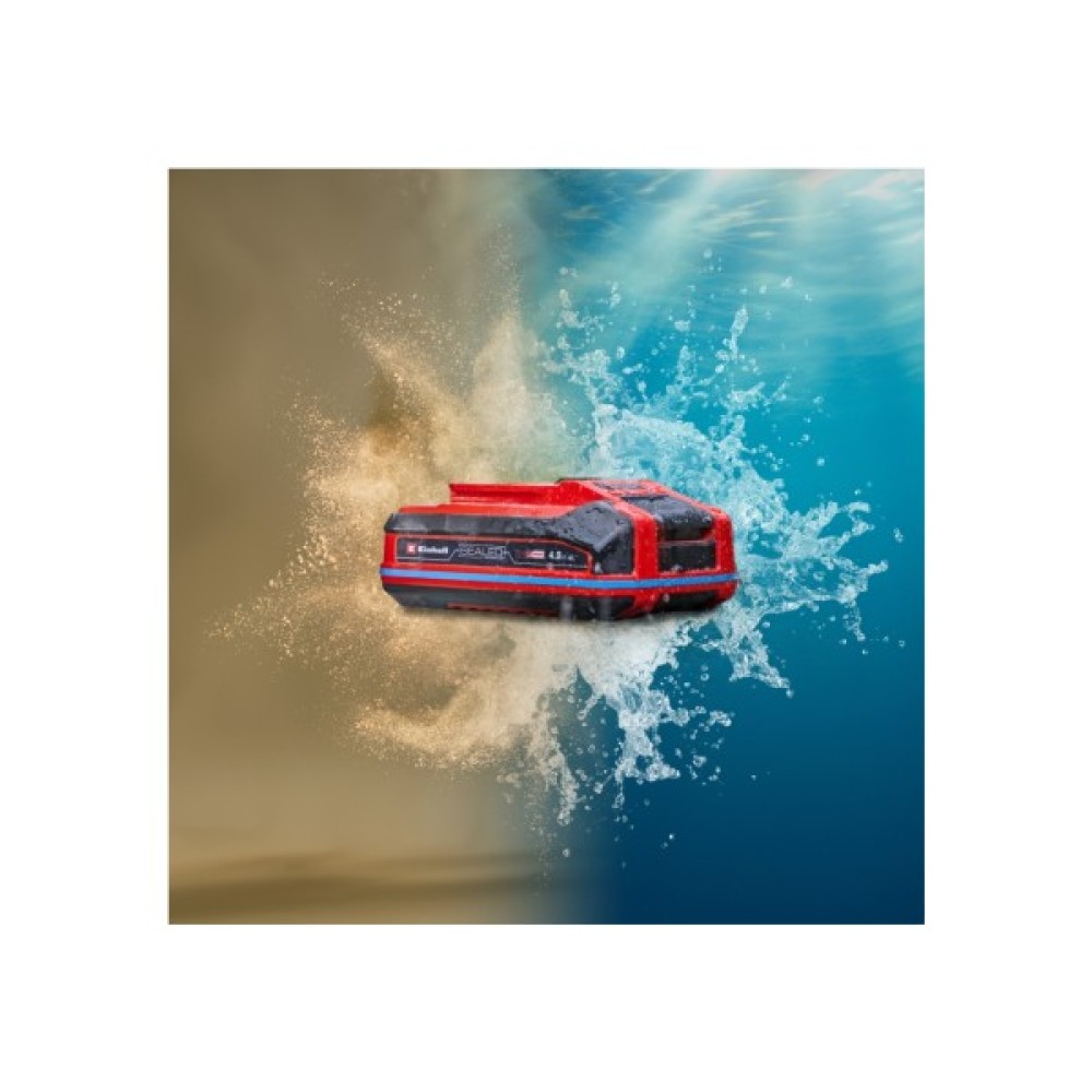 Einhell 18 V 4.0 Ah SEALED Power X-Change PLUS — акумулятор із герметичним корпусом (IP57), водо- та пилонепроникний, забезпечує 100% більше потужності, компактний і легкий. Технологія PLUS додає потужності для складних завдань, система ABS забезпечує безпеку та довговічність, а LED-індикатор показує заряд.