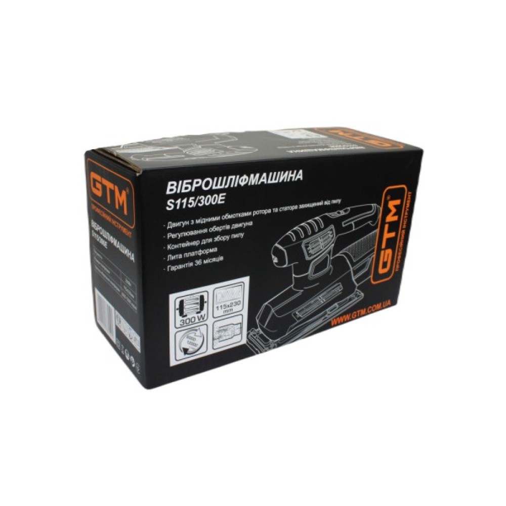 GTM S115/300E є вібраційною шліфувальною машиною, потужність якої складає 300 Вт. Вона ідеально підходить для роботи з деревом, бетоном, металом, пластиком та іншими матеріалами. Виріб має розмір стрічки 230 х 115 мм, що дозволяє легко обробляти різні за розміром поверхні, навіть стіни та стелі.