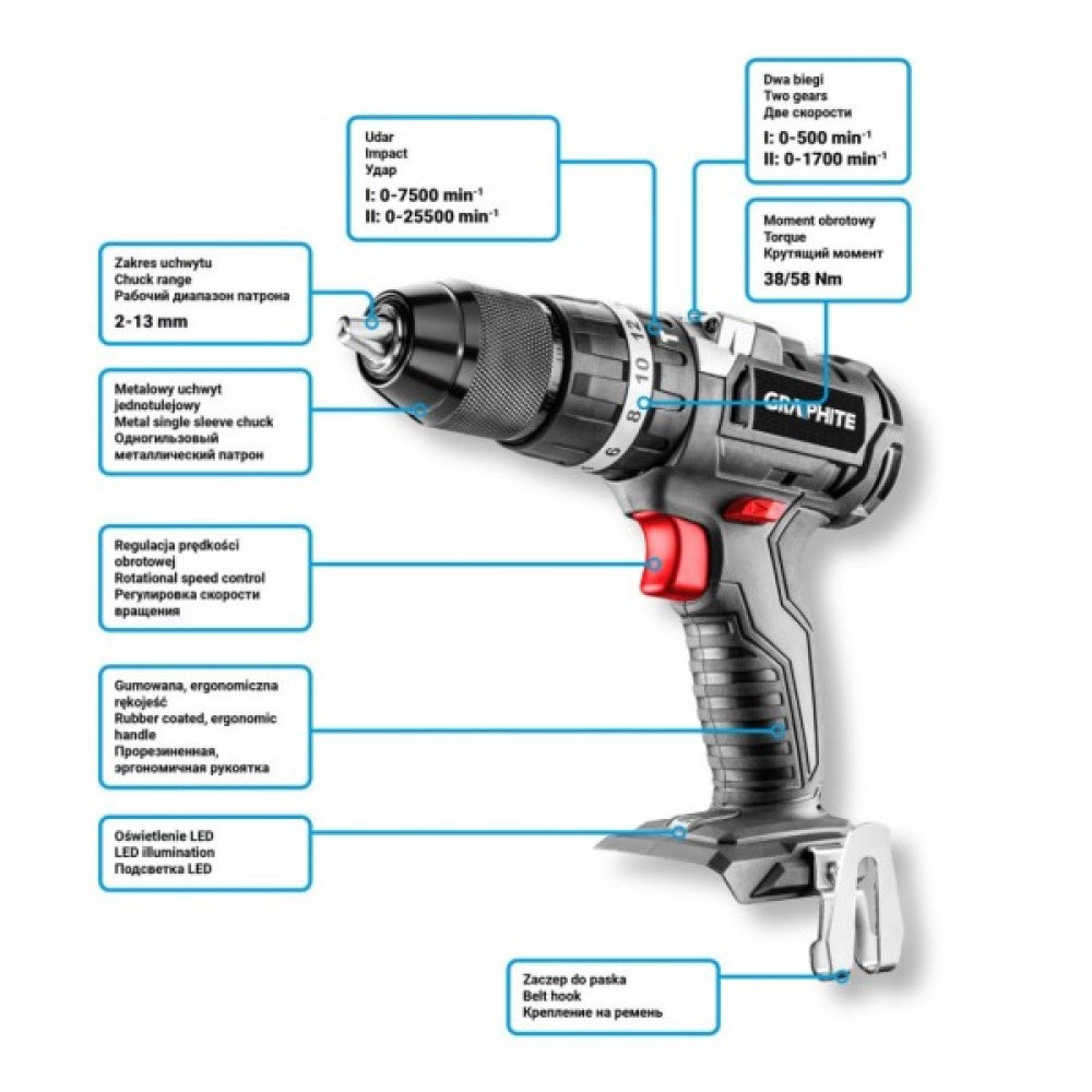 рукоятка з м'якою накладкою; блокування вмикання; скоба для кріплення до поясу; реверс; клас захисту iii; гальмо двигуна