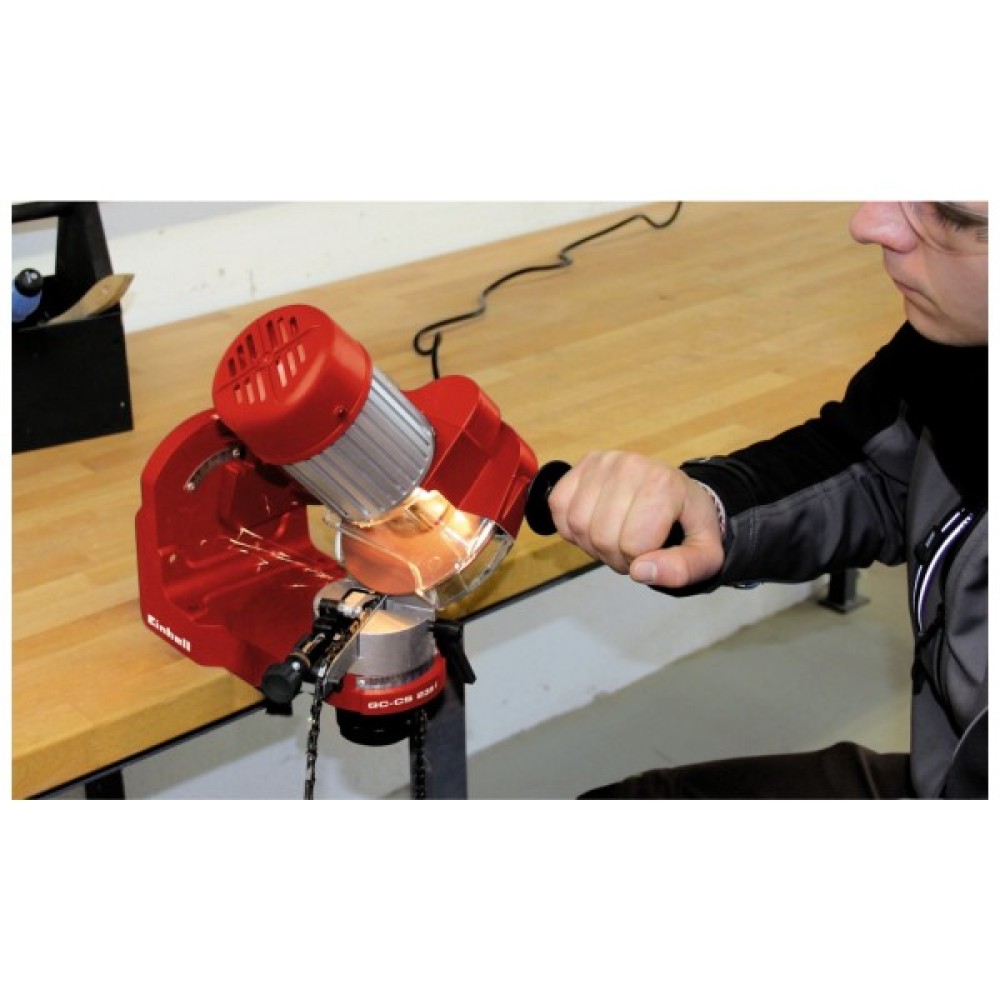 Верстат для заточування ланцюгів Einhell GC-CS 235 E компактний, міцний і надійний, призначений для точного заточування всіх типів ланцюгів, що застосовуються на бензо/електропилках. Точне заточування різців досягається за допомогою опускання шліфувального диска простим натисканням на ручку Einhell GC-CS 235 E, завдяки шкалі для точного регулювання кута шліфування та кута нахилу шліфувальної головки, зручного затискного механізму ланцюга.