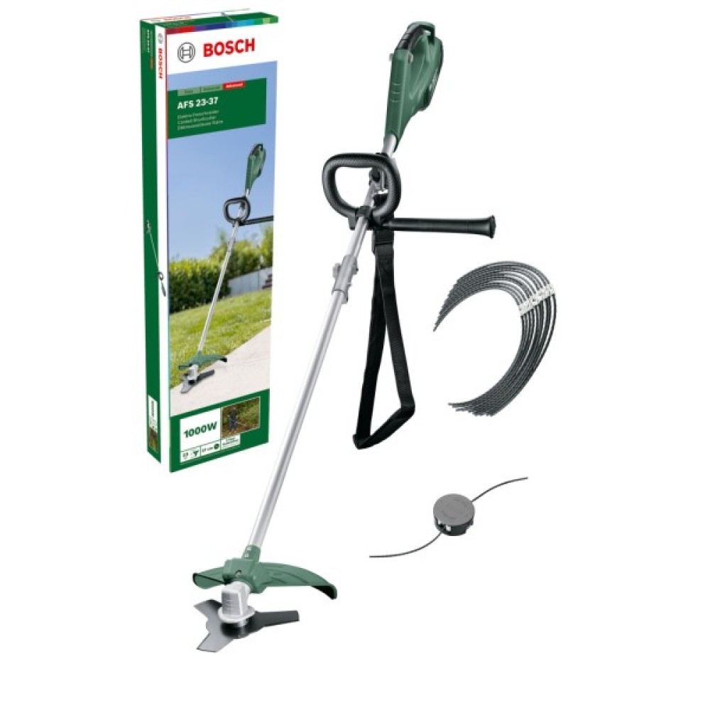 - Цей потужний садовий триммер Bosch AFS 23-37 з 1000-ватним двигуном призначений для ефективного догляду за садом та дачною ділянкою. Він однаково добре працює як з тримірною ліскою, так і з ножем, забезпечуючи ширину скошування 23 см і 37 см відповідно. . Додатково поставляється ремінь для балансування навантаження на плечі та спину, що робить роботу з триммером менш стомлюючим. Потрійний ніж та нейлонова волосінь діаметром 3.5 мм дозволяють легко прорідити кущі, молоді рослини та зрізати бур'яни.