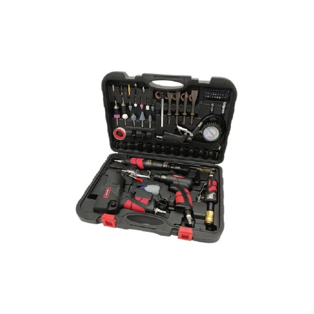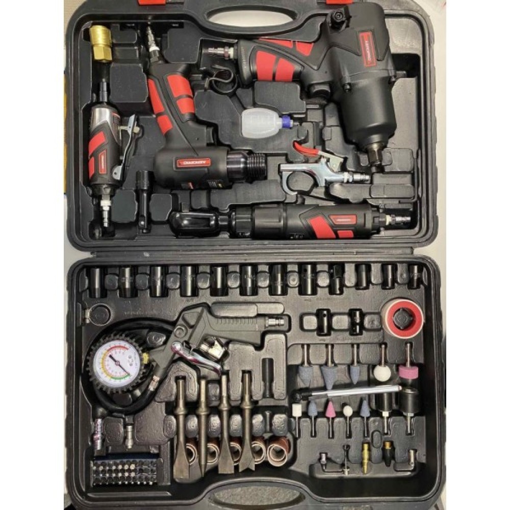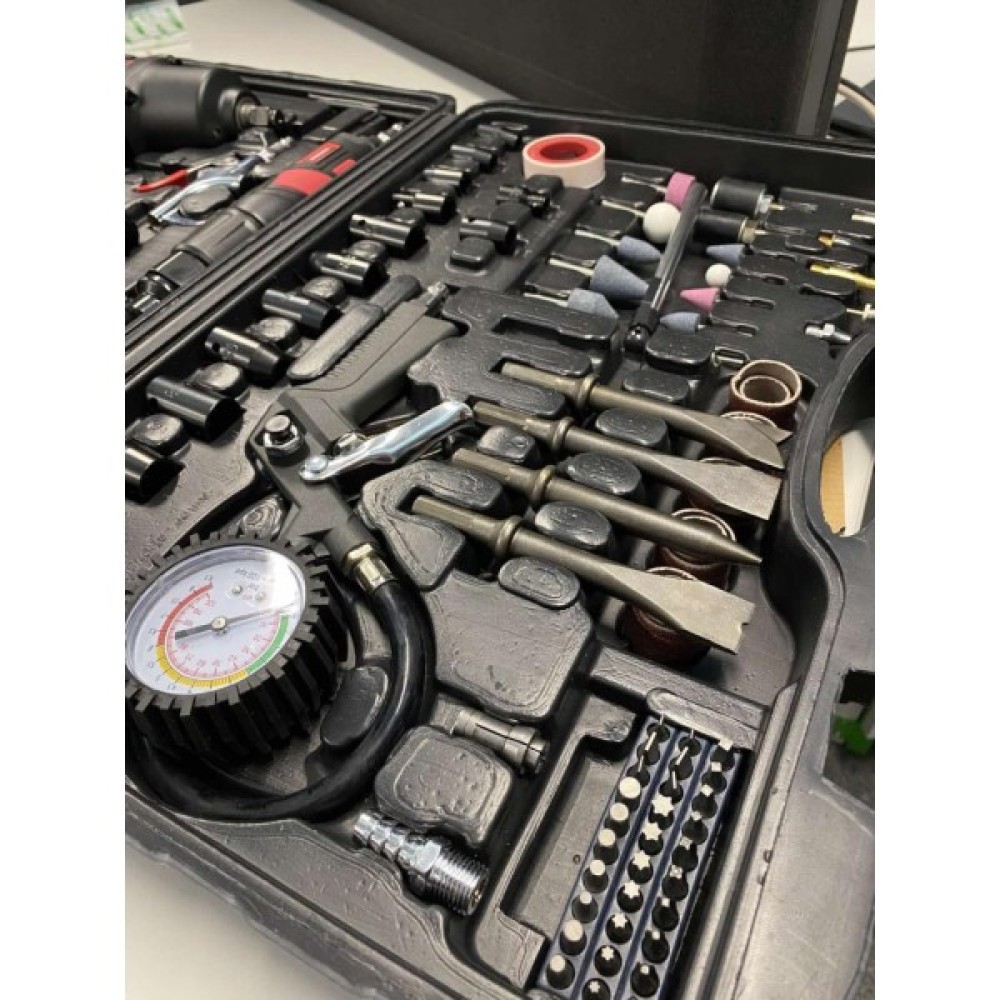 Особливо варто відзначити пневматичні інструменти з набору: пістолет продувний, гайковерт, гайковий ключ, зубило, пневматичний молоток, пістолет для підкачки шин та зачистна машинка. Вони забезпечують високу продуктивність і точність під час виконання робіт, гарантуючи ефективні результати в короткі терміни.