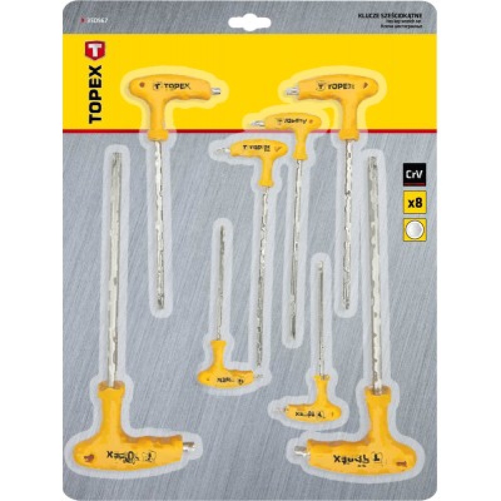 Для зручності використання, кожен ключ оснащений ергономічною Т-подібною ручкою із пластмаси, що забезпечує надійний захват і комфорт під час роботи. Ретельно продуманий дизайн робить набір Topex не тільки високоякісним, але й привабливим вибором для тих, хто бажає мати інструменти, що підходять для широкого кола завдань.