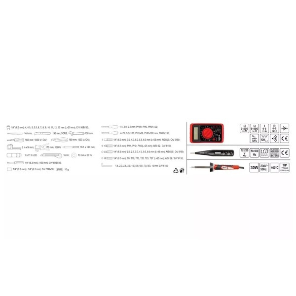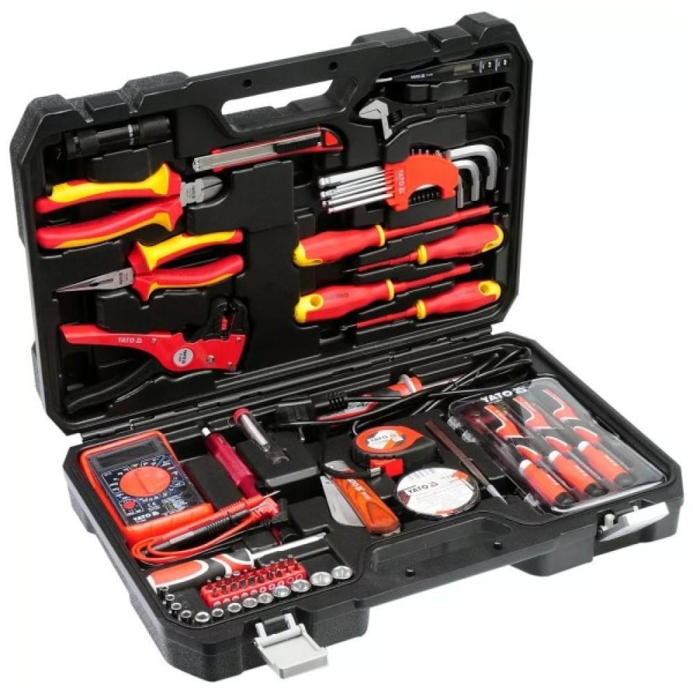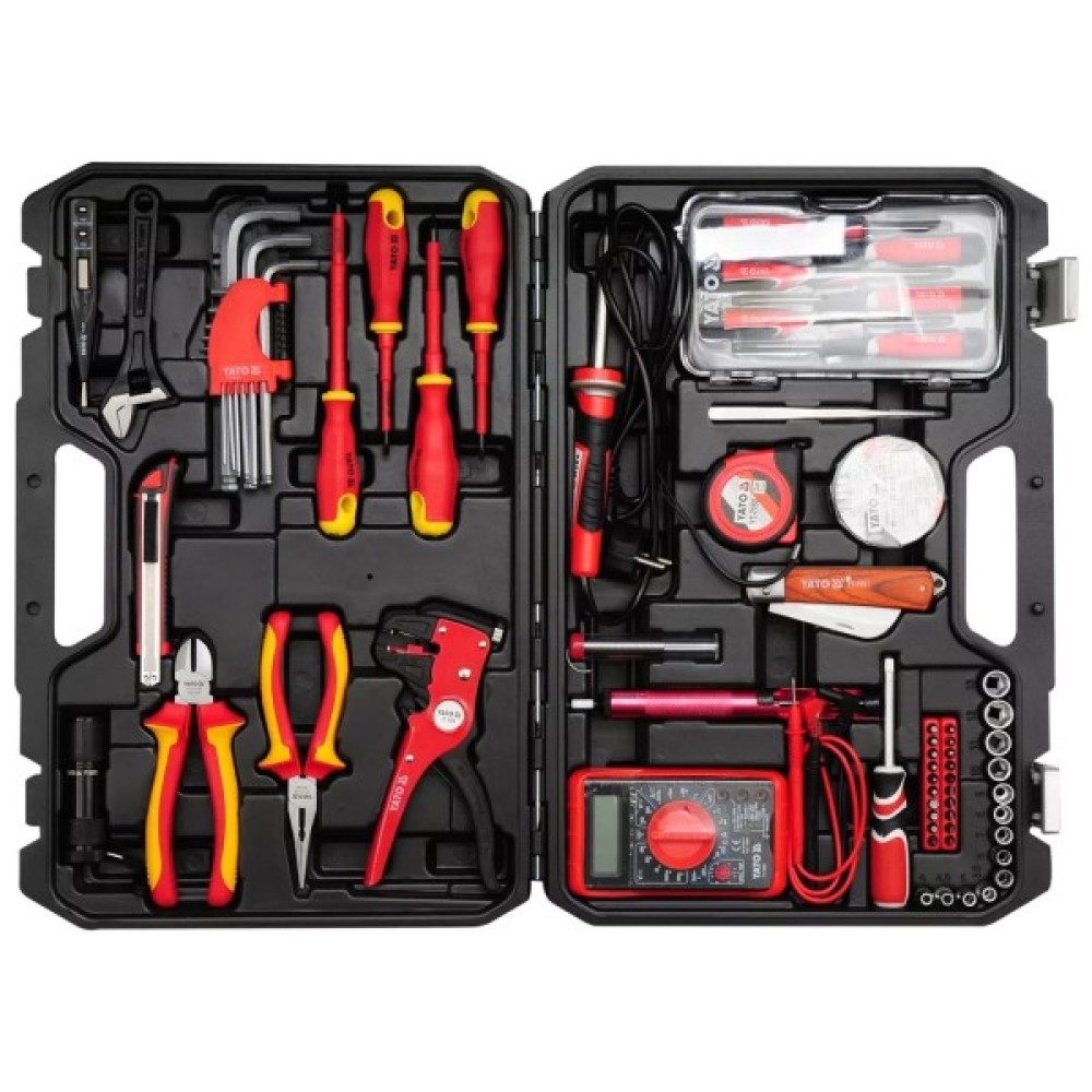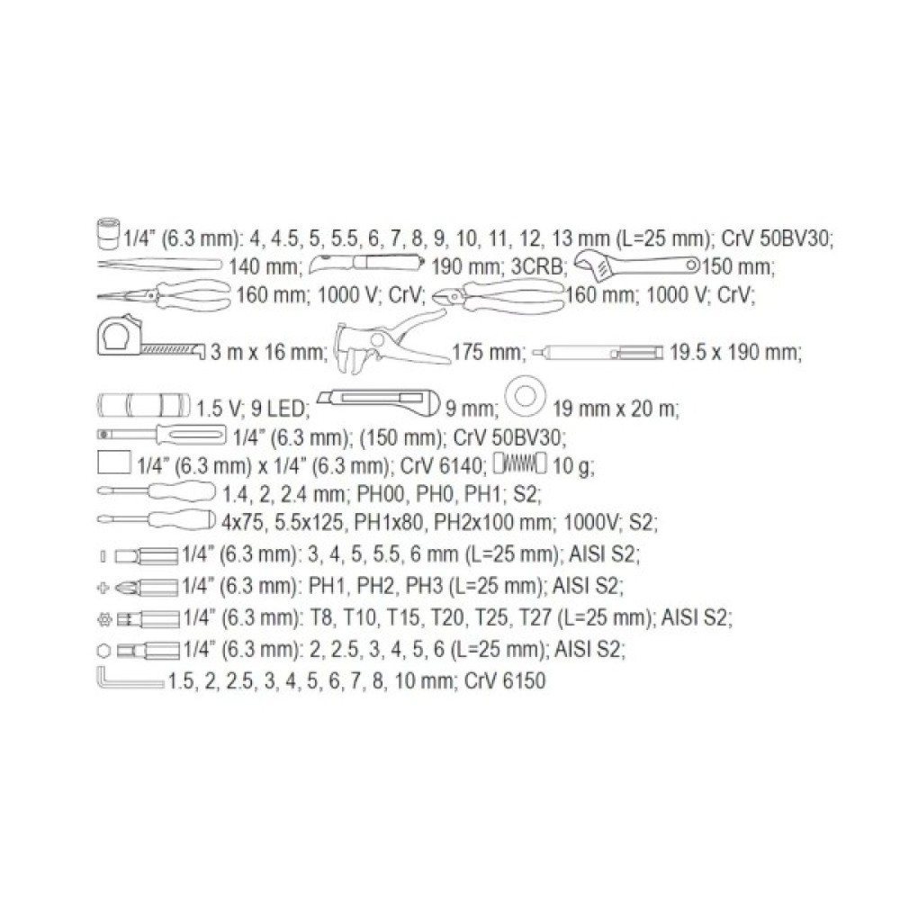 Комплектація набору викрутки; торцеві головки; біти; шестигранні/зіркоподібні ключі; ліхтарик; пінцети; паяльник; мультиметр; бокорізи; кліщі; рулетка; ніж; знімач ізоляції; ізострічка