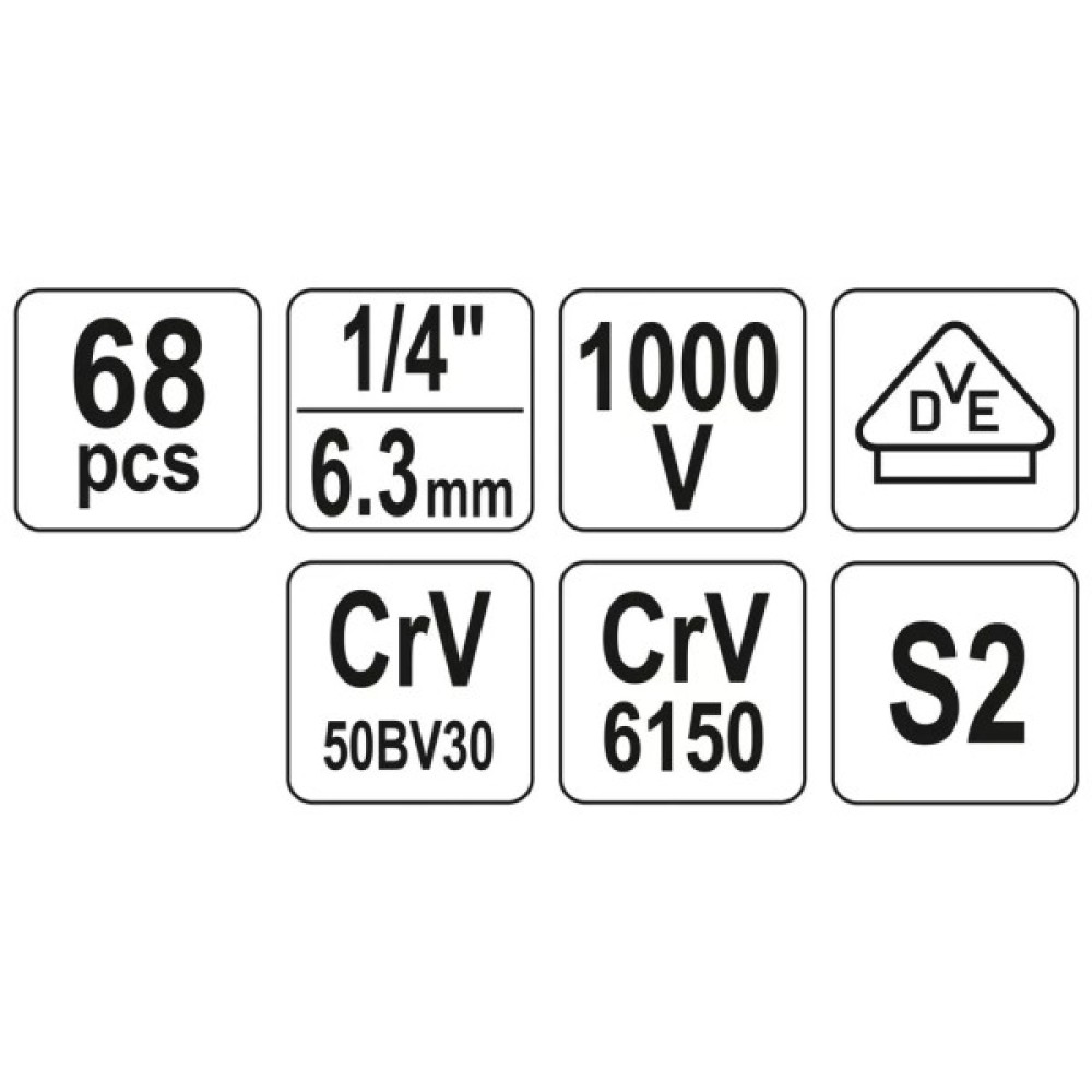 Окрім того, набір включає 13 торцевих головок з шестигранним профілем, виконаних у стандартній довжині, що забезпечує взаємозамінність і простоту використання. Ці головки варіюються від 1/4" x 4 мм до 1/4" x 13 мм, надаючи можливість легко впоратися з завданнями будь-якої складності.